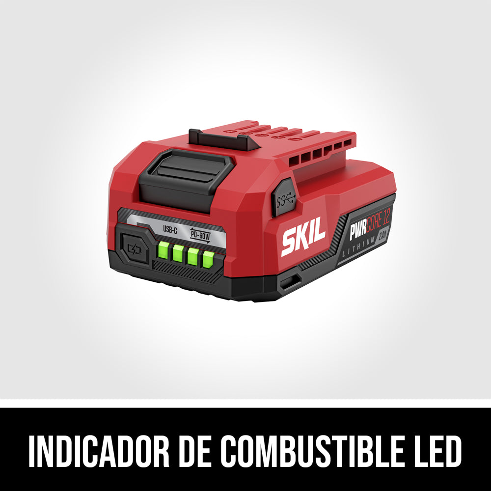 Compatible con todas las herramientas SKIL de 12 V del sistema PWRCORE 12™, la batería USB-C compacta y ligera PWRCORE 12™ de 2,0 Ah y 12 V cuenta con carga rápida bidireccional a través de USB-C, lo cual le permite a usted cargar la batería o dispositivos personales con su puerto USB-C integrado. Su puerto USB-C PD 3.0 suministra ofrece una potencia hasta 12 veces más alta que las baterías SKIL con puertos USB-A para alimentar una amplia gama de dispositivos o cargarlos rápidamente cuando usted va de un lugar a otro. Su indicador de combustible LED muestra el estado de carga actual de la batería en incrementos del 25 por ciento. Cuando es momento de recargar, esta batería de 2,0 Ah se cargará en cualquier base de carga SKIL de 12 V, así como en cualquier bloque de carga USB-C doméstico.