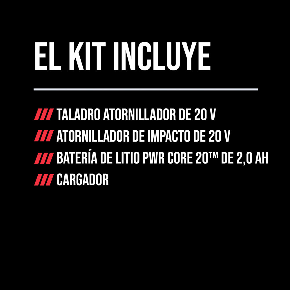 Qué está incluido: (1) Taladro atornillador subcompacto PWRCORE 20™ de 20 V sin escobillas [DL6293B-00]; (1) atornillador de impacto subcompacto PWRCORE 20™ de 20 V sin escobillas [ID6739B-00]; (1) batería de litio PWRCORE 20™ de 2,0 Ah y 20 V [BY519702]; (1) cargador automático PWRCORE 20™ PWRJump™ [QC536001]; (2) brocas PH2; (2) clips de cinturón; (1) funda de batería