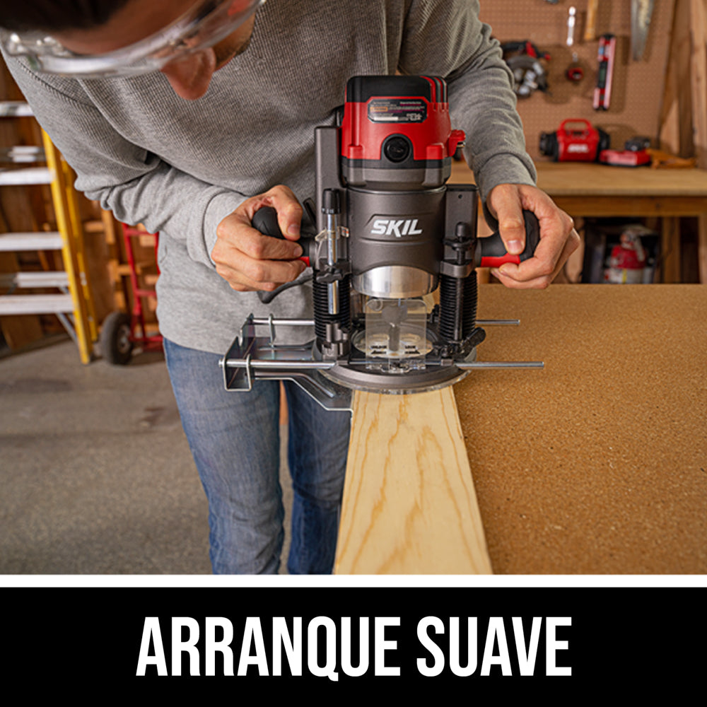 Versatilidad y potencia. Esta fresadora para el trabajo de la madera le permite a usted cambiar fácilmente entre base fija y base de inmersión, y tiene la potencia de 14 A para que usted pueda realizar más tareas. Con tecnología de arranque suave, la fresadora arranca despacio y aumenta la velocidad para dar tiempo a realizar ajustes. Y además ofrece ajustes de profundidad precisos y control de velocidad para mantener unas RPM óptimas. Las empuñaduras ergonómicas limitan la vibración y reducen la fatiga durante el uso prolongado.