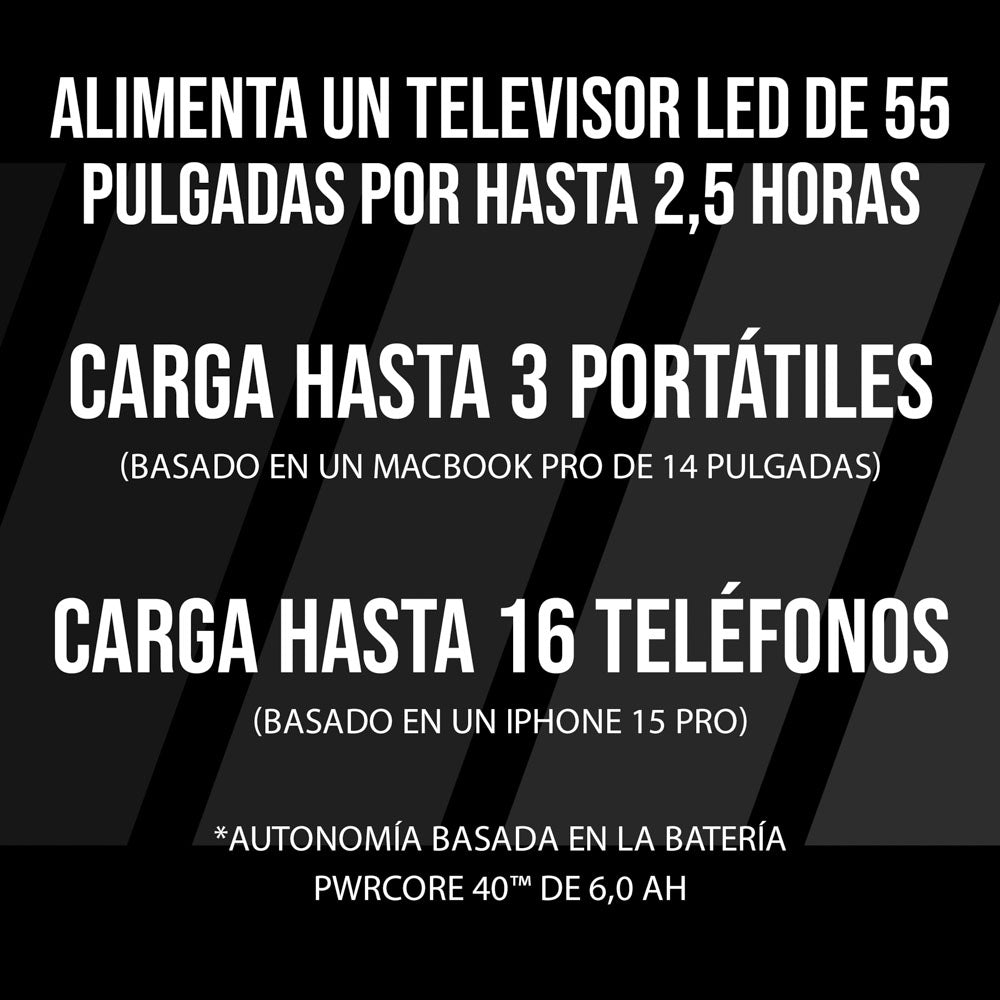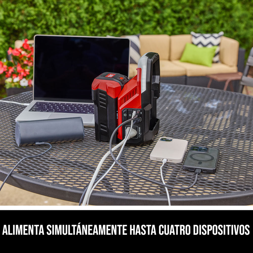 Lleve potencia a cualquier lugar con el inversor SKIL PWRCORE 40™ de 40 V de 300 W. El inversor de alimentación inalámbrico produce 300 W de potencia continua con hasta 500 W de potencia pico. El inversor de 300 W alimenta simultáneamente hasta cuatro dispositivos a través de su tomacorriente estándar 120 V o sus puertos de salida USB-A, USB-C y USB-C PD de 65 W. La onda sinusoidal pura produce potencia limpia y de alta calidad para sistemas electrónicos sensibles. Una luz LED con dos ajustes de luminosidad está incorporada en la conveniente agarradera de transporte para llevar energía a cualquier lugar. Apoye dispositivos pequeños con la base de soporte a bordo del inversor de alimentación o almacene un dispositivo móvil en el bolsillo para teléfono. El inversor es compatible con todas las baterías SKIL PWRCORE 40™ (vendidas por separado).