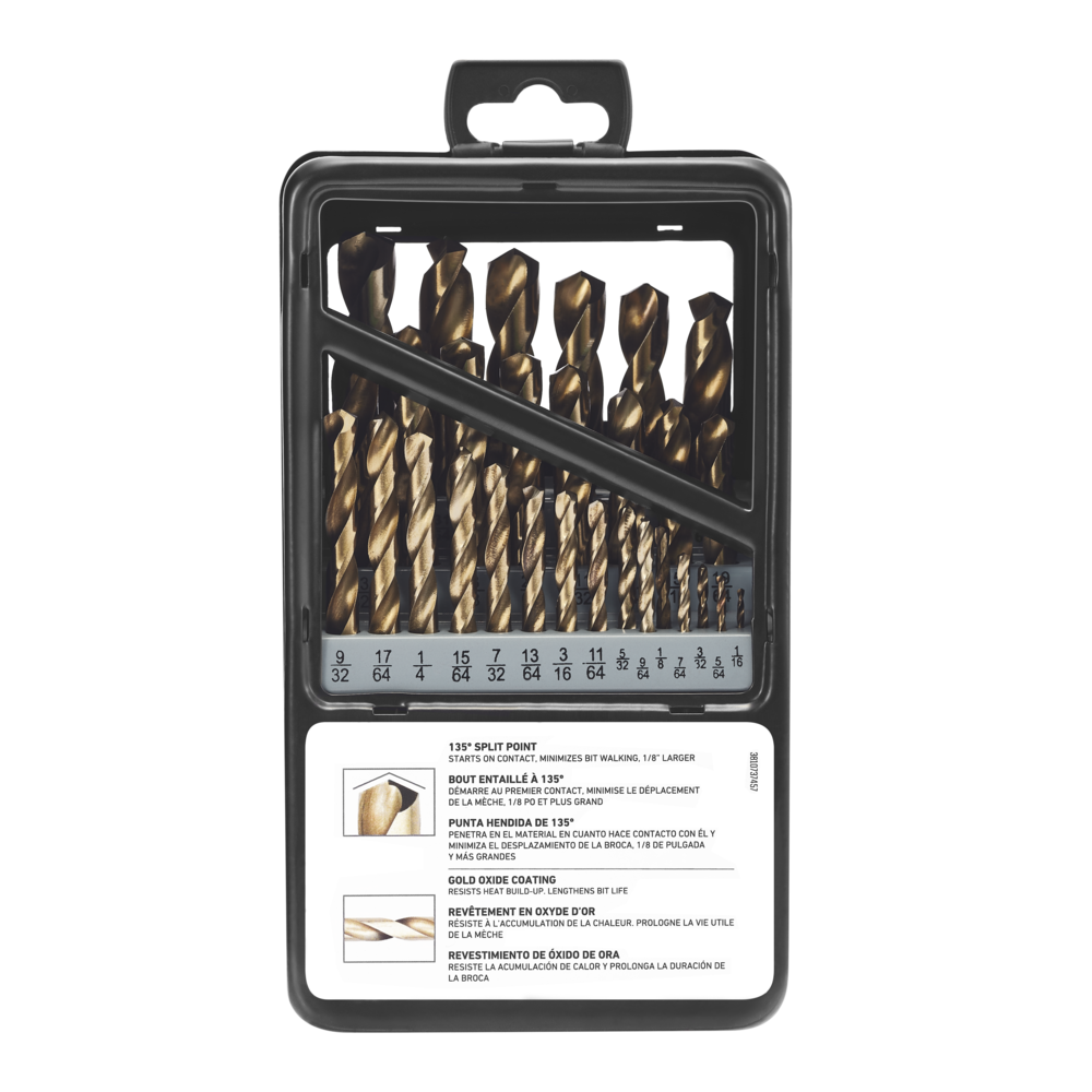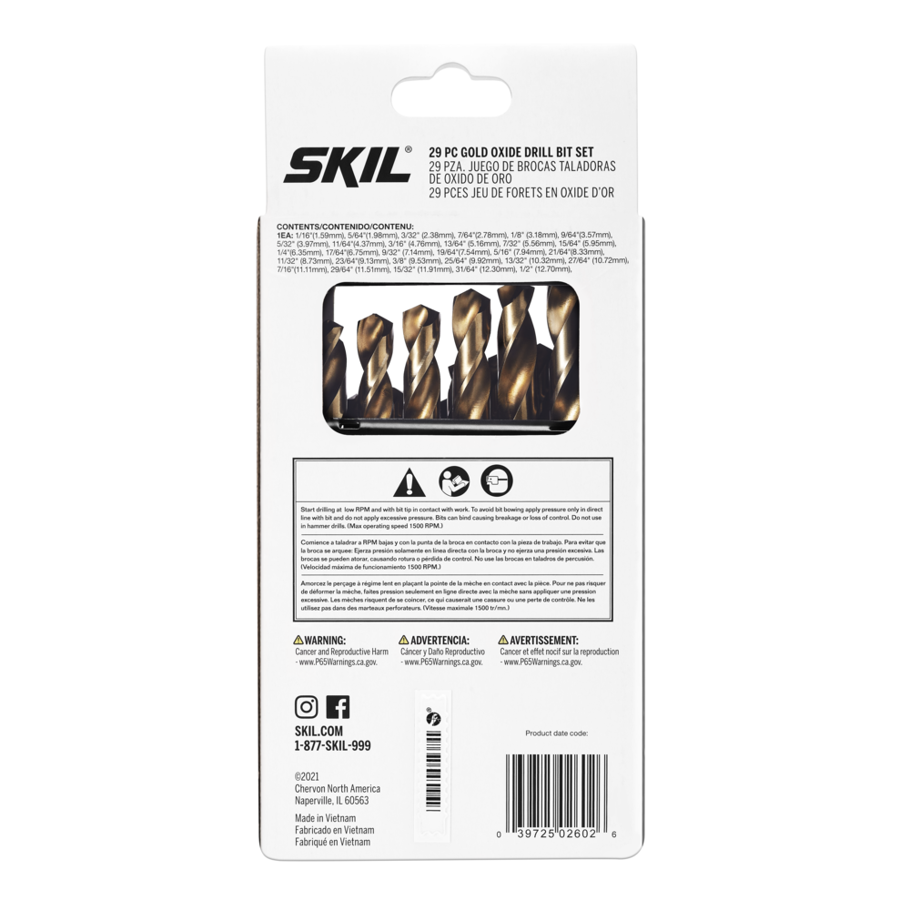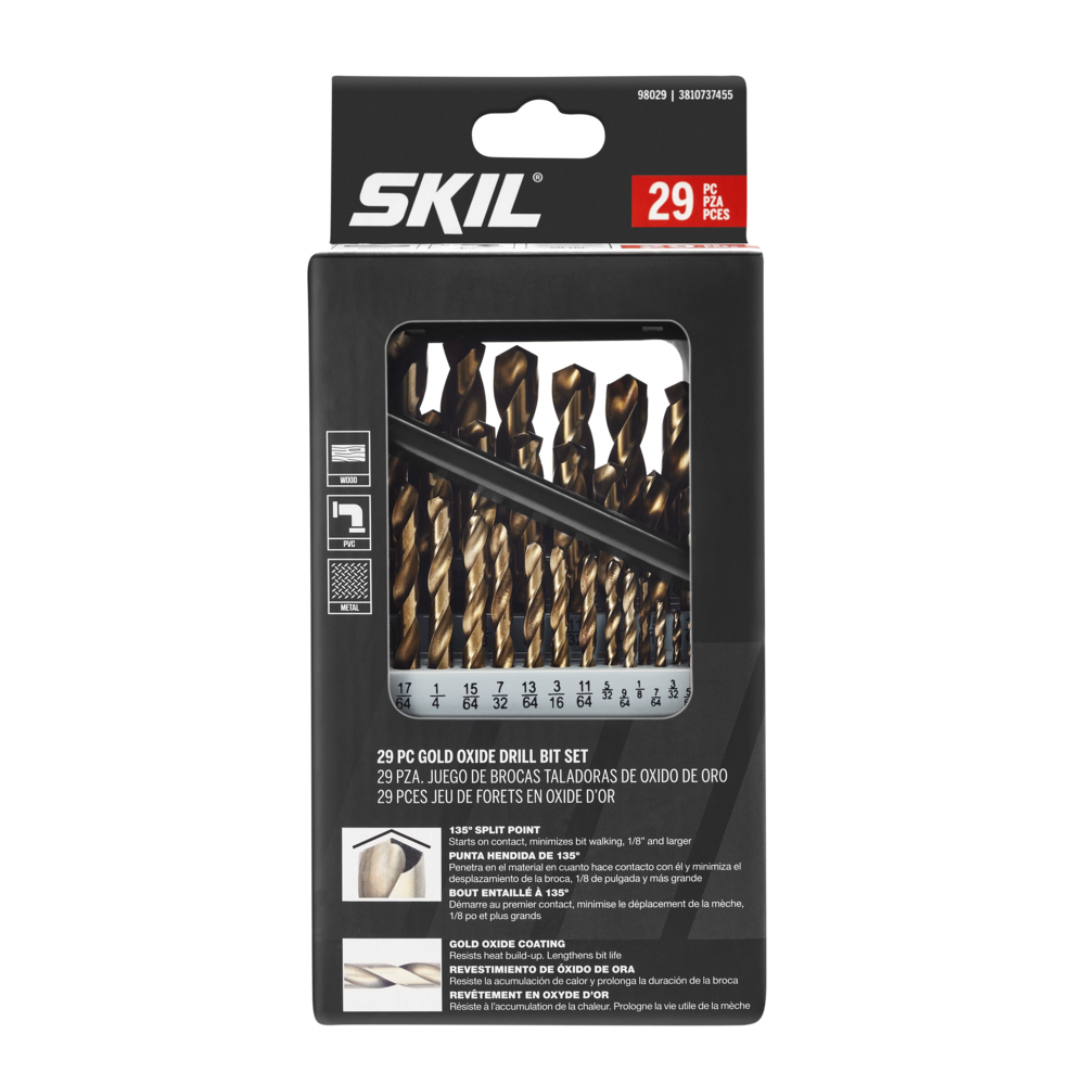 El conjunto de brocas taladradoras de óxido de oro de 29 piezas SKIL incluye 29 brocas taladradoras para aplicaciones comunes, entre las que se encuentran taladrado en chapa metálica, metal de calibre mediano, madera y plástico. Todas las brocas del conjunto incluyen un recubrimiento de óxido de oro que resiste la acumulación de calor y prolonga la vida útil de las brocas. Las brocas de 1/8 de pulgada y más grandes cuentan con una punta hendida de 135 grados que comienza el agujero al hacer contacto para minimizar la desviación de la broca con el fin de lograr una colocación precisa y realizar agujeros limpios y libres de rebabas. Las brocas vienen en un maletín de transporte para facilitar el acceso y la organización.