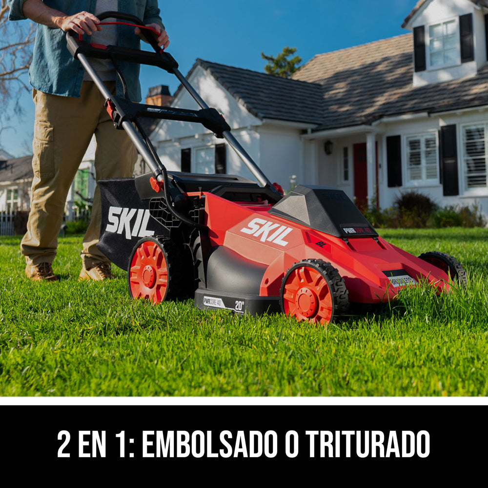 La cortadora de césped autopropulsada de 20 pulgadas SKIL PWRCORE 40™ de 40 V sin escobillas combina un motor digital sin escobillas con tecnología de litio PWRCORE 40™ para ofrecer un rendimiento de corte potente y facilidad de uso conveniente. Usted tendrá el control desde el principio hasta el final con esta cortadora de césped inalámbrica gracias a su arranque por botón pulsador y su autopropulsión con un dial de control de velocidad para escoger su ritmo de trabajo. La cortadora de césped produce cortes 2 en 1 con la opción de embolsar o triturar con la bolsa de pasto y el tapón de trituración incluidos. Ajuste fácilmente la altura de corte a siete posiciones con una sola palanca. Y cuando se complete la tarea, la empuñadura telescópica se pliega completamente hacia abajo, lo cual permite el almacenamiento vertical. Este kit de cortadora de césped eléctrica Incluye una batería de litio PWRCORE 40™ de 6,0 Ah y un cargador automático PWRJUMP™.