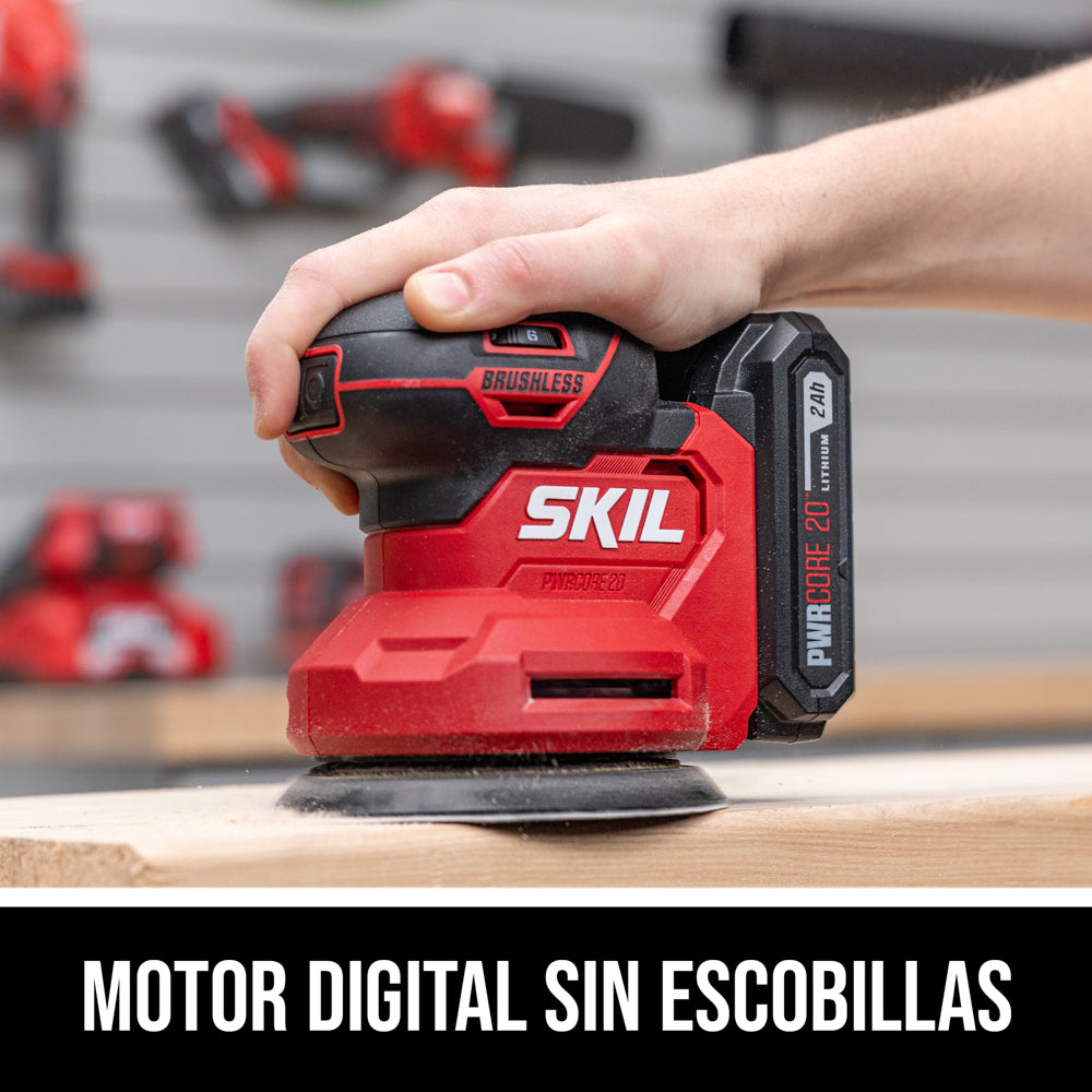 Ponga los toques de acabado en proyectos de trabajo de la madera, como rehabilitaciones de gabinetes y reacabado de muebles, con la lijadora de órbita al azar SKIL de 20 V. Su motor digital sin escobillas produce lijado de alto rendimiento con hasta 11.000 OPM. La lijadora eléctrica inalámbrica de perfil bajo cuenta con un agarre blando con sobremoldura con ergonomía cómoda para ofrecer un mejor control. Está diseñada para producir una vibración reducida con el fin de causar menos fatiga y ofrecer un tiempo de trabajo prolongado. Seleccione velocidades precisas con un control máximo en una variedad de superficies utilizando el dial de velocidad variable. Mantenga limpia el área de trabajo con el puerto de extracción de polvo de 1-1/4 pulgadas que se conecta a la bolsa colectora de polvo o al adaptador de aspiración incluidos. El kit incluye la lijadora inalámbrica, una batería de 20 V y 2,0 Ah, un cargador de 20 V, una bolsa colectora de polvo y (3) papeles de lija.