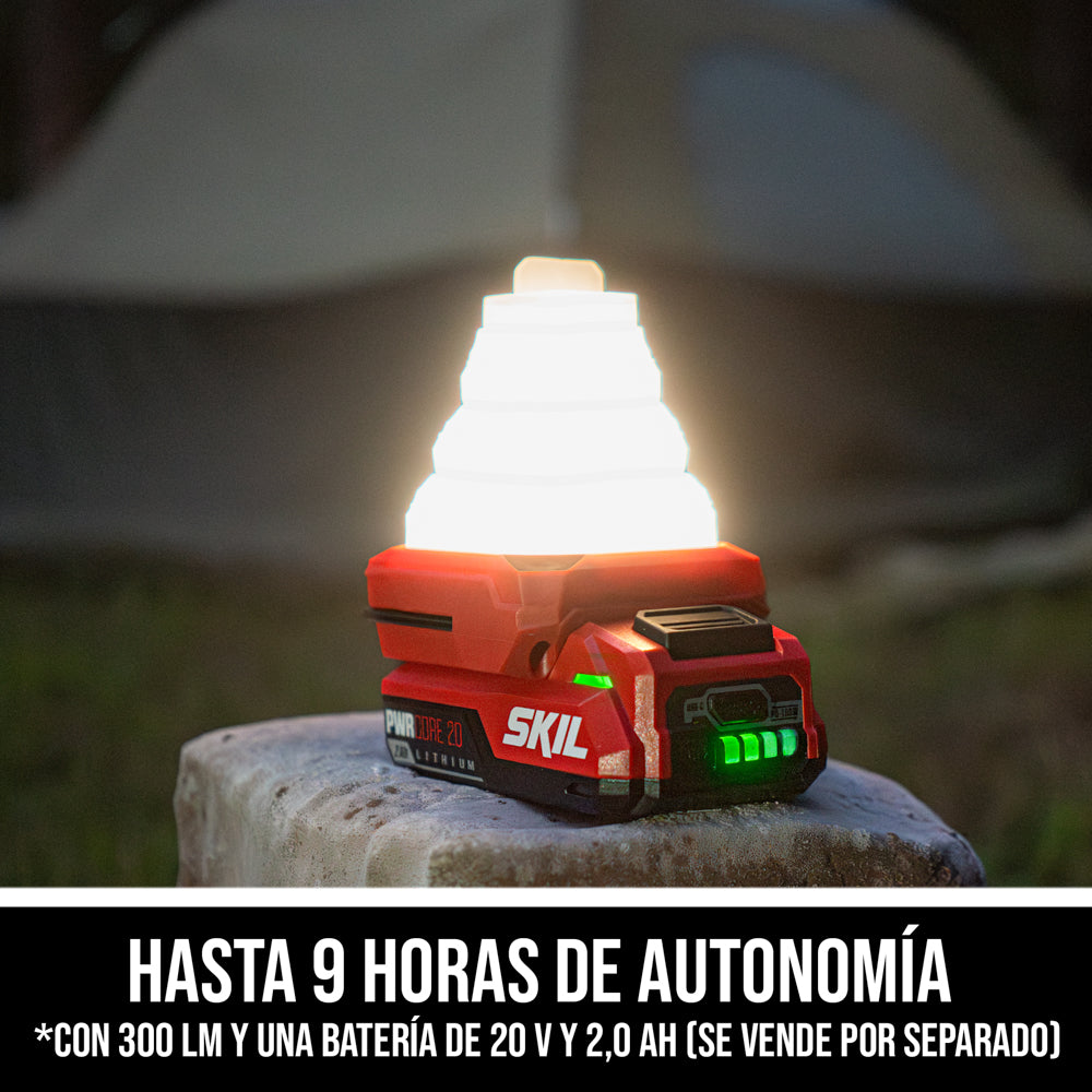 Ya sea que usted está de acampada o que necesita una luz que sea fácil de empacar y transportar, el farol colapsable SKIL de 12/20 V proporciona hasta 300 lúmenes de iluminación de 360 grados que se colapsa para ocupar poco espacio con el fin de facilitar el transporte y el almacenamiento. Cuenta con un gancho retráctil para montaje versátil, tanto si es colgándolo en una tienda de campaña como de una rama de árbol o debajo del fregadero o lavamanos. Un puerto de salida USB-C le permite a usted alimentar y cargar dispositivos mientras el farol está en uso.