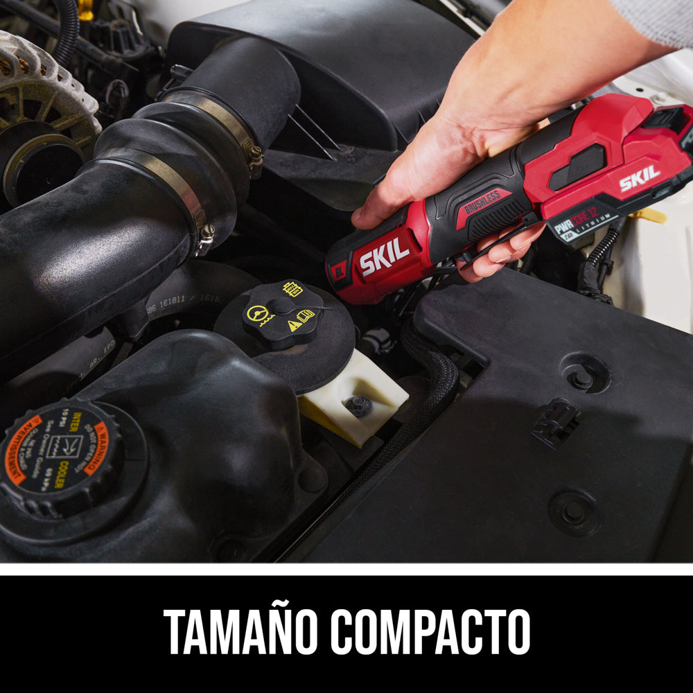 La llave de carraca de 3/8 de pulgada SKIL de 12 V sin escobillas aporta potencia a los espacios más reducidos con su diseño de cabezal de perfil bajo y potente fuerza de torsión, que le permite a usted trabajar en un compartimiento de motor sin ningún problema. Tanto si está en el garaje como ensamblado muebles, no busque más, ya que esta llave de carraca aprieta tuercas, pernos o sujetadores con facilidad. Esta llave de carraca inalámbrica sin escobillas viene equipada con un gatillo de velocidad variable para ofrecer un control preciso de la velocidad hasta 220 RPM, a la vez que produce hasta 55 pies-libra de fuerza de torsión máx.; su estructura de alta resistencia soporta hasta 150 pies-libra de fuerza de torsión manual máx. La luz LED incorporada permite un uso rápido en entornos reducidos tenuemente iluminados, tales como debajo del capó o bajo el auto. La batería USB-C de 12 V y 2,0 Ah incluida cuenta con carga rápida bidireccional que le permite a usted cargar la batería o dispositivos portátiles con su puerto USB-C de 60 W. Cuando es momento de recargar la batería, el cargador multifuncional elimina la base de carga tradicional para herramientas eléctricas con el fin de ofrecer un conveniente formato compacto que se puede enchufar en cualquier lugar. El kit de llave de carraca alimentada por batería incluye la llave de carraca de 12 V, una batería USB-C de 2,0 Ah, un cargador USB-C de 20 W, un cable de carga USB-C y un adaptador de bocallaves de 3/8 a 1/4 de pulgada.