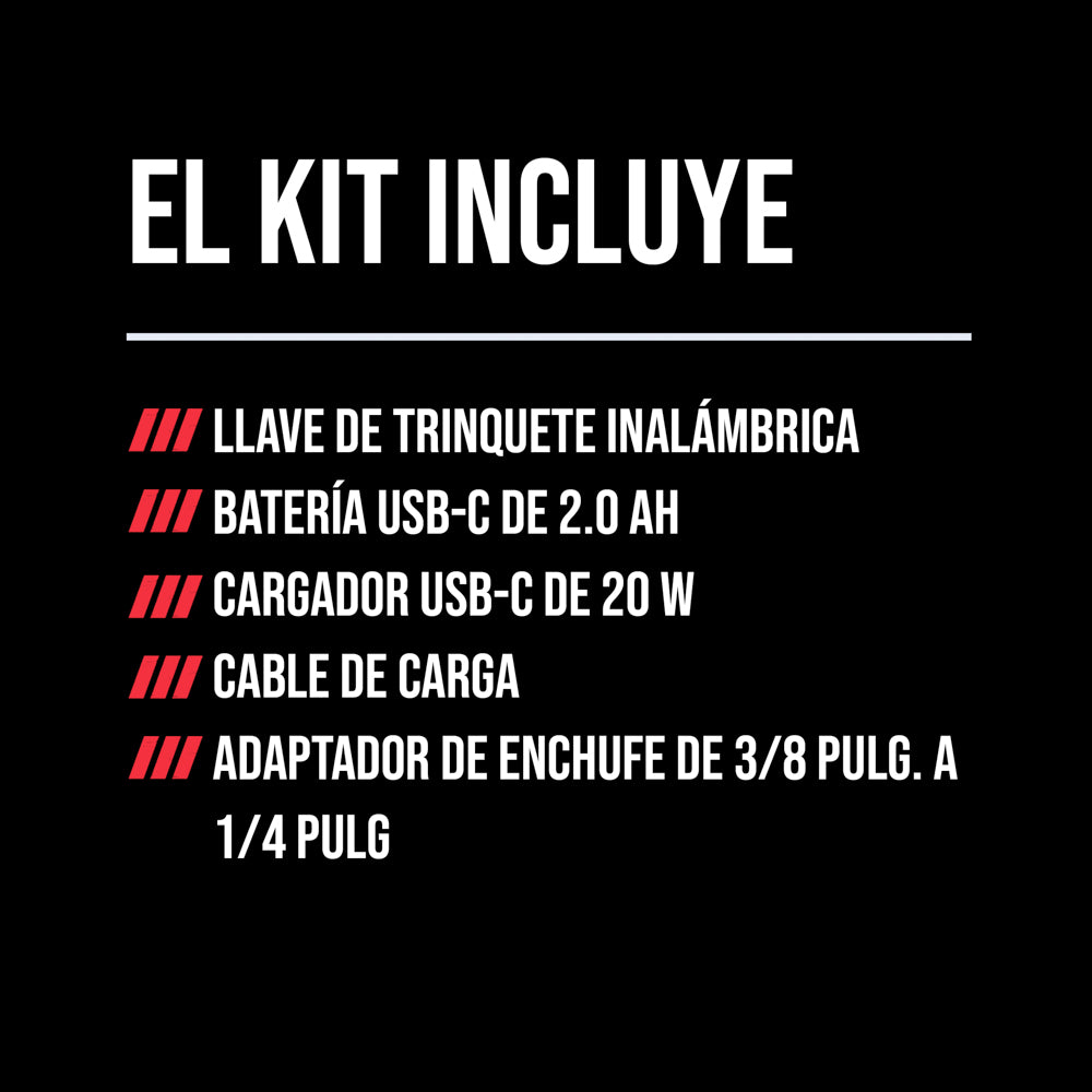 - LLAVE DE CARRACA CON BATERÍA Y CARGADOR INCLUIDOS: El conjunto incluye la llave de carraca inalámbrica, una batería USB-C de 2,0 Ah, un cargador USB-C de 20 W, un cable de carga USB-C y un adaptador de bocallaves de 3/8 a 1/4 de pulgada