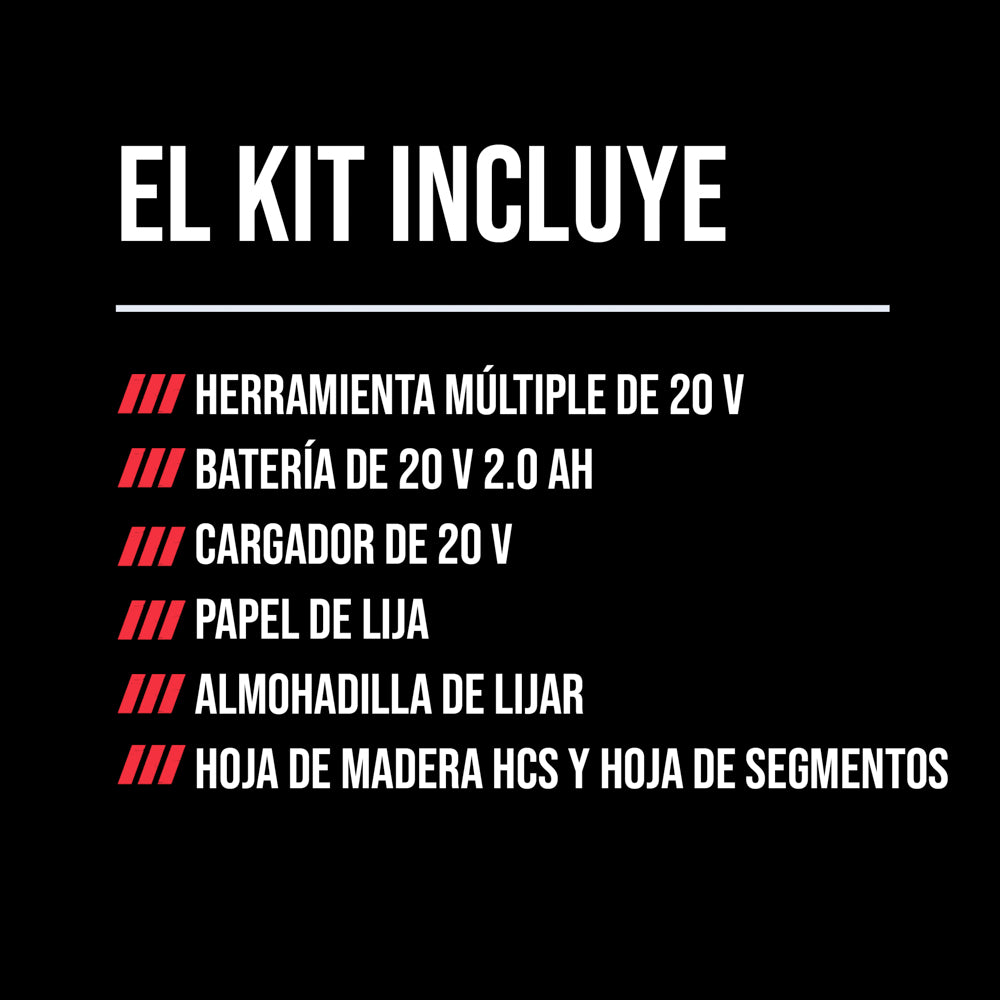 - KIT DE MULTIHERRAMIENTA OSCILANTE INALÁMBRICA: El conjunto incluye la multiherramienta de 20 V, una batería de 20V y 2,0 Ah, un cargador de 20 V, (9) papeles de lija, una almohadilla de lijar, una hoja de HCS para madera y una hoja semicircular de HCS
