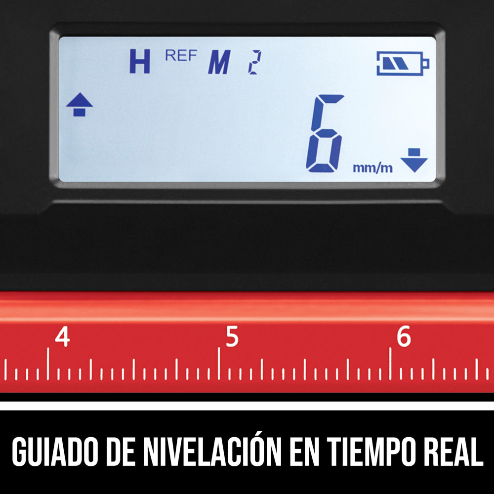 - Fácil de usar: Los indicadores de flecha hacia arriba y hacia abajo le proporcionan guiado de nivelación en tiempo real y un tono audible opcional le avisa al alcanzar 0°, 45° o 90°.