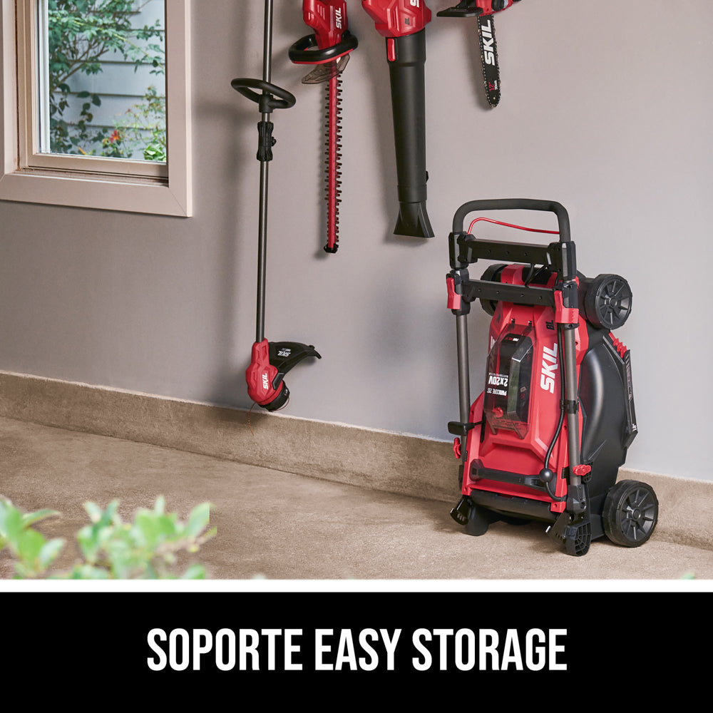 - SOPORTE EASY STORAGE: Esta orilladora de arbustos viene equipada con un gancho y un soporte Easy Storage, para que usted almacene convenientemente todo su equipo para exteriores SKIL PWRCORE 20™ con facilidad