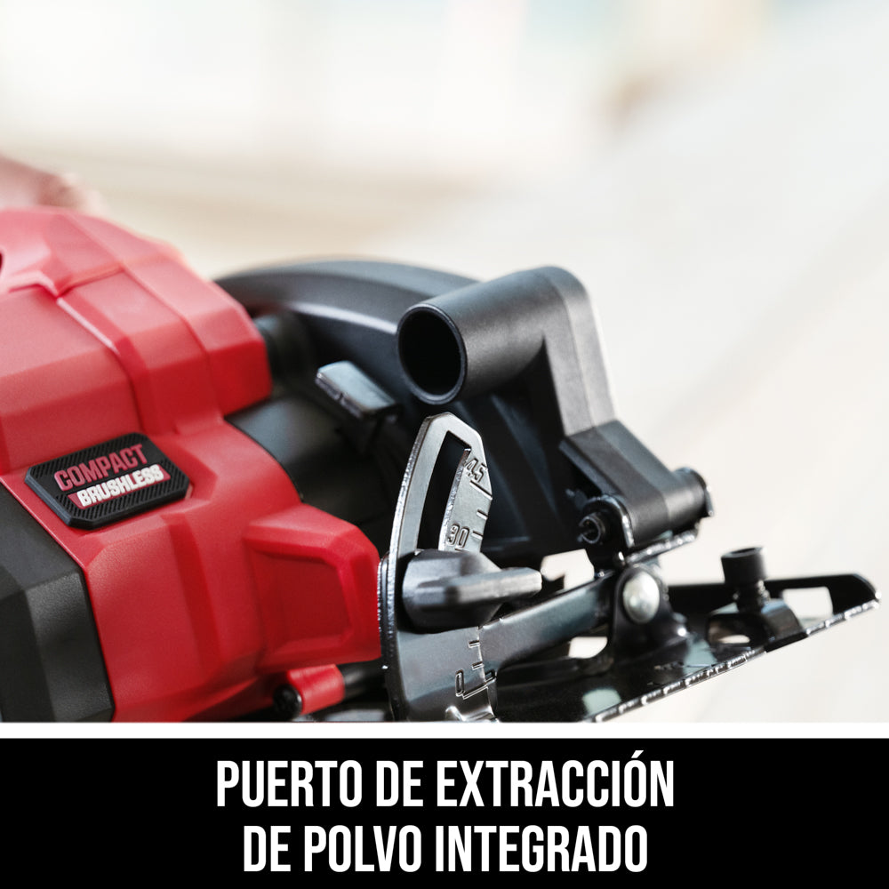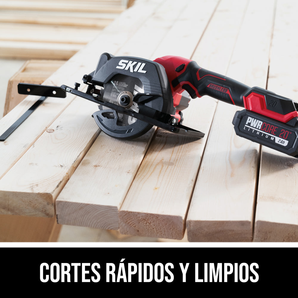 Qué está incluido: (1) Sierra circular de uso con una mano con hoja a la izquierda PWRCore 20™ de 20 V [CR5435B-00], (1) llave hexagonal, (1) adaptador de aspiración, (1) hoja de 4-1/2 pulgadas de 24 D con puntas de carburo, (1) tope-guía para cortar al hilo, (1) batería PWRCore 20™ de 20 V y 2,0 Ah con carga móvil PWRASSIST™ [BY519702], (1) funda de batería, (1) cargador automático PWRCore 20™ PWRJump™ de 20 V [QC536001], (2) anillos adaptadores