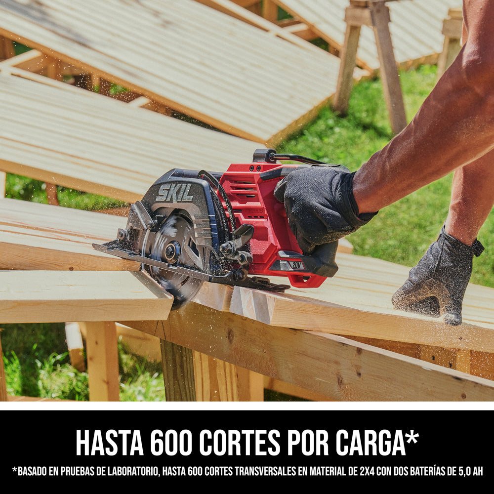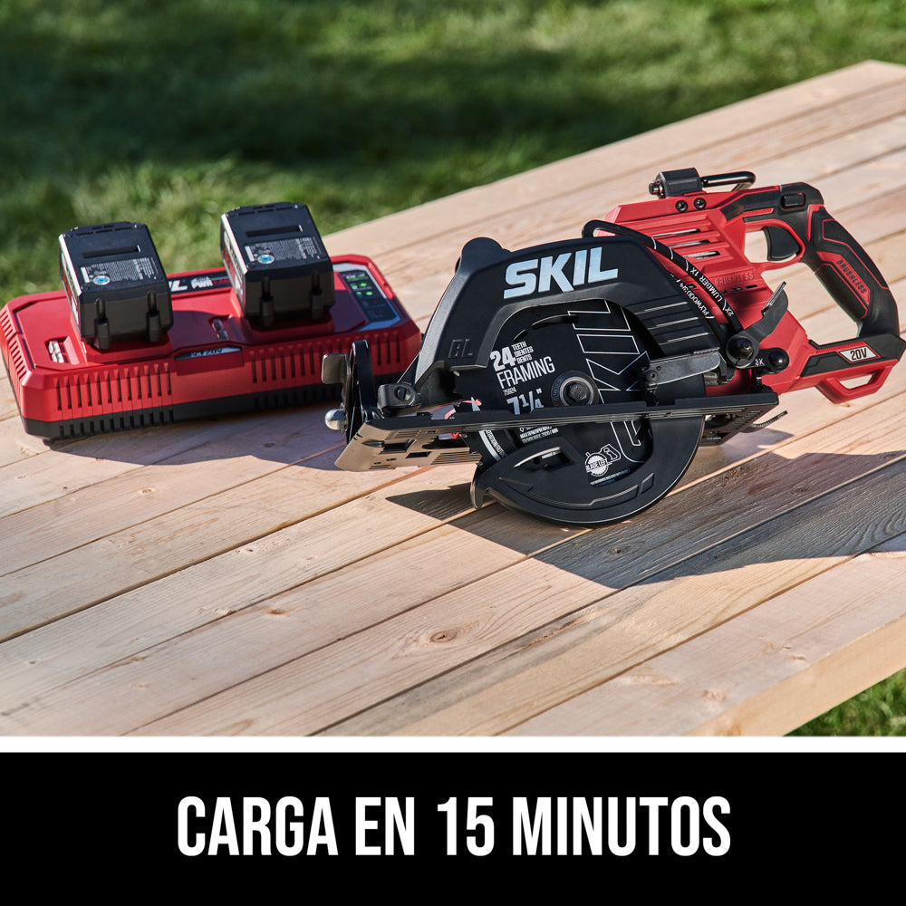 Qué está incluido: (1) Sierra circular de 7-1/4 pulgadas con empuñadura trasera SKIL PWR CORE 20™ de 2 x 20 V sin escobillas [CR5429B-00], (2) batería de litio SKIL PWRCore 20™ de 20 V y 5,0 Ah (BY519603), (1) cargador con puerto dual SKIL de 20 V y 2 X 150 W (QC5359B-02)