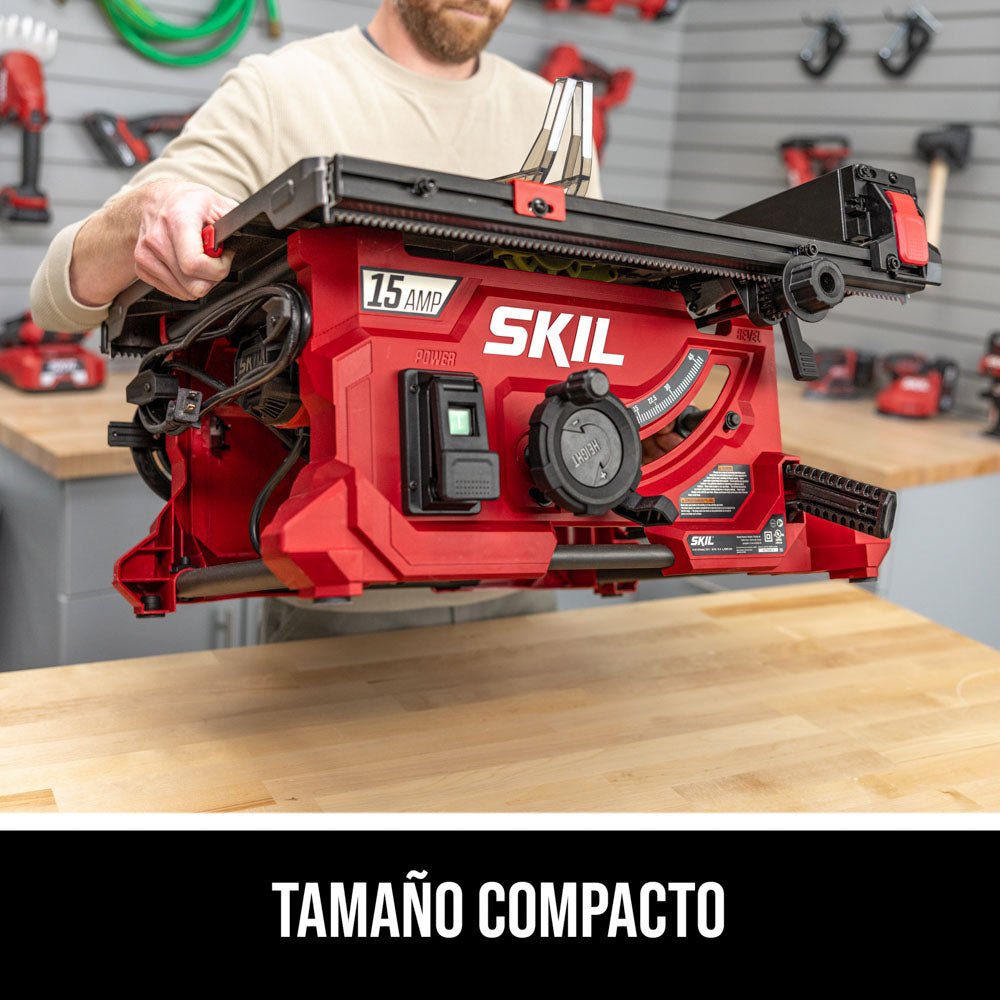 La sierra de mesa compacta de 8-1/4 pulgadas SKIL de 13 A produce potencia para una gama de aplicaciones y cortes, tanto si usted está cortando tablas de terraza como si está instalando el armazón de una pared en la remodelación de un sótano, construyendo un bar y más. Corte al hilo planchas de madera contrachapada, haga cortes transversales y corte juntas de mortaja con confianza con los carriles del tope-guía de piñón y cremallera que garantizan que el tope-guía permanezca paralelo para realizar cortes rápidos, uniformes y precisos. Su tamaño compacto hace que sea fácil de transportar y almacenar entre usos. La mesa de aluminio ofrece un rendimiento de corte de alta calidad, mientras que un puerto de extracción de polvo redirige el polvo hacia un recipiente para facilitar la limpieza. La alineación paralela de la hoja permite realizar ajustes fáciles de la hoja a lo largo del tope-guía para cortar al hilo y la ranura de ingletes, para realizar cortes exactos y precisos. Un interruptor de seguridad produce un apagado inmediato para ofrecer seguridad adicional. La sierra de mesa viene con un calibre de ingletes, un palo de empuje, un sistema de protector modular, un tope-guía, trinquete antirretroceso, (2) llaves de cambio de hoja y un codo del puerto de extracción de polvo.