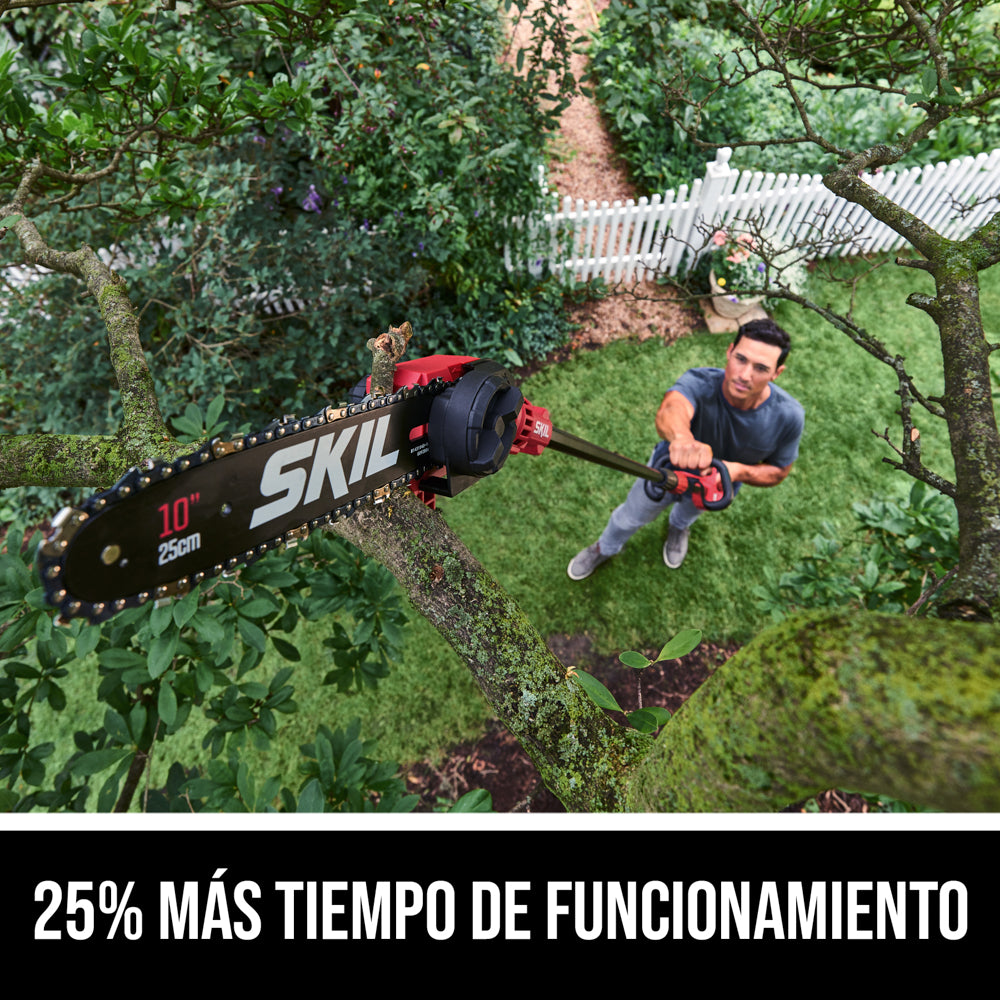 Obtenga rendimiento líder de la industria con una sierra de pértiga inalámbrica alimentada por tecnología de litio SKIL PWRCORE 40™. Añada más potencia y durabilidad a su cobertizo de herramientas con una sierra de pértiga eléctrica telescópica impulsada por un motor digital sin escobillas. El eje telescópico de aluminio ligero se extiende de 7,5 a 10 pies de longitud, mientras que el cabezal angulado de espada y cadena de 10 pulgadas proporciona mayor control para los trabajos más difíciles de alcanzar. Esta podadora de árboles cuenta con una cadena autolubricante para reducir la fricción y mejorar la durabilidad, mientras que el tensado de la cadena sin herramientas permite realizar ajustes sin inconvenientes. Este kit de sierra de pértiga incluye una batería PWRCORE 40™ de 2,5 Ah y 40 V y un cargador automático PWRJUMP™.