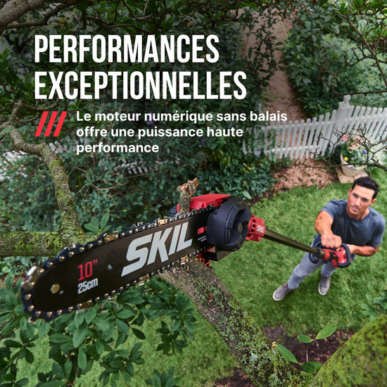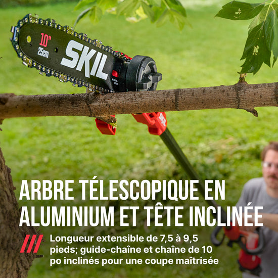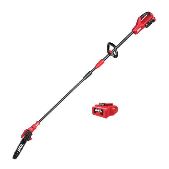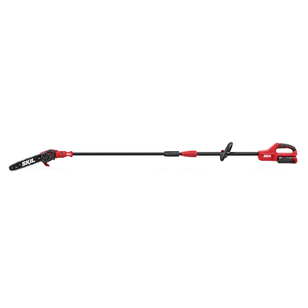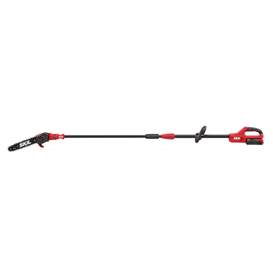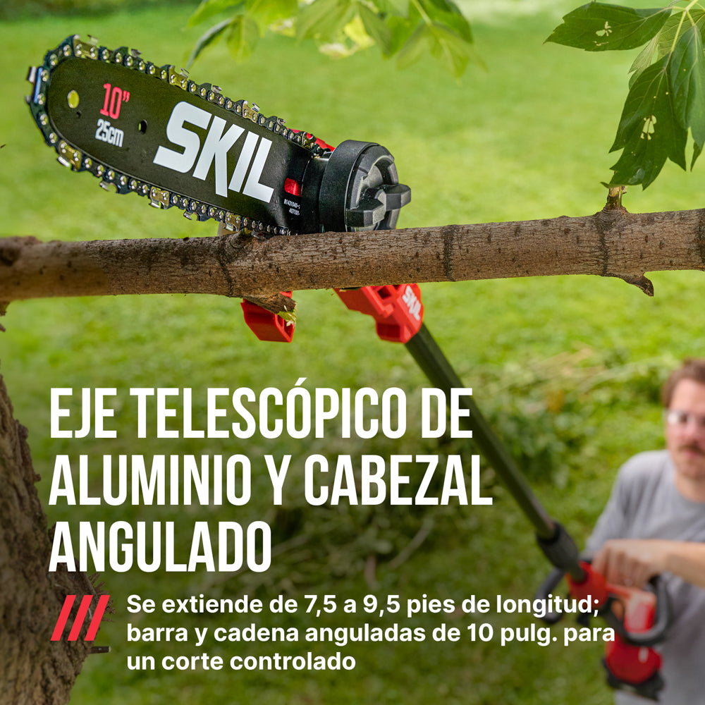 Añada alcance de corte y durabilidad a su cobertizo de herramientas con la sierra de pértiga SKIL de 10 pulgadas de 40 V sin escobillas. La sierra de pértiga eléctrica inalámbrica cuenta con un motor digital sin escobillas que produce potencia eficiente de alto rendimiento sin el inconveniente de la gasolina. Su eje telescópico de aluminio ligero se extiende de 7,5 a 9,5 pies para extender el alcance, lo cual la hace una opción ideal entre las sierras de pértiga para podar árboles. Su espada y cadena autolubricante de 10 pulgadas en ángulo produce cortes controlados versátiles con una capacidad de corte de 7,5 pulgadas, mientras que su mango auxiliar ajustable le permite a usted seleccionar su agarre preferido para tener aún más control cuando corte por encima de la cabeza. Apriete la cadena de la recortadora de árboles con el giro de un dial para realizar ajustes sin inconvenientes entre cortes. El kit de sierra de pértiga a batería incluye la sierra de pértiga de 40 V, una batería de 2,0 Ah y un cargador de 60 W.