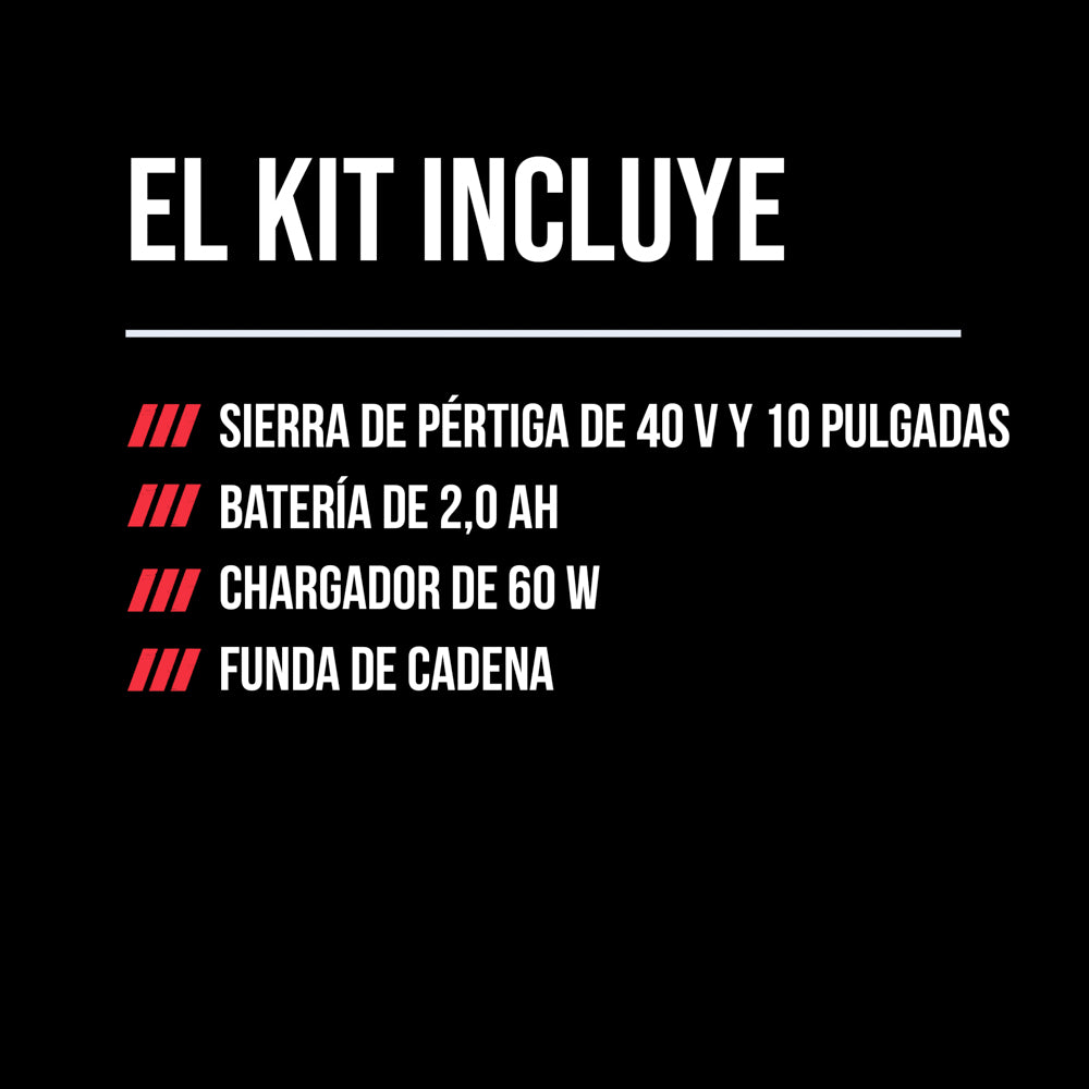- SIERRA DE PÉRTIGA INALÁMBRICA CON BATERÍA Y CARGADOR INCLUIDOS – El kit incluye la sierra de pértiga de 40 V, una batería de 40 V y 2,0 Ah, y un cargador de 60 W