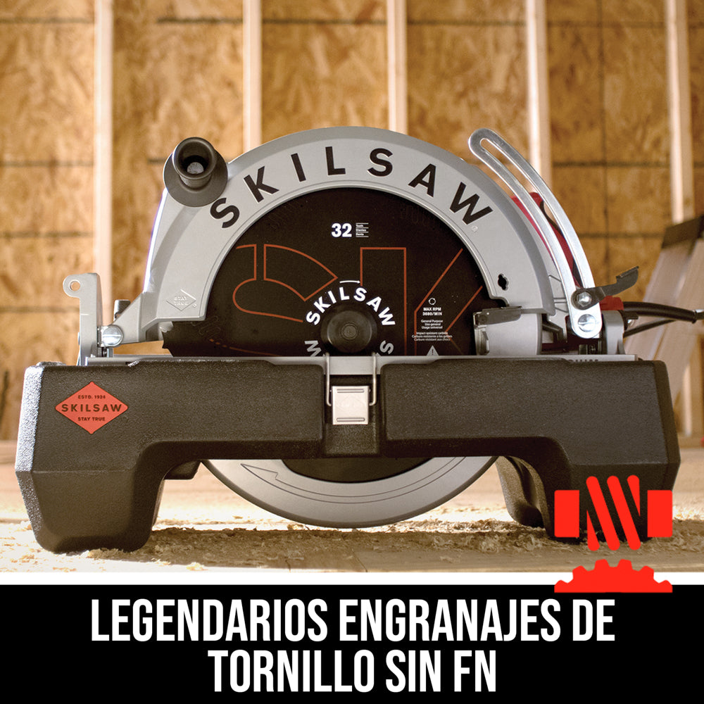 Esta sierra Skilsaw de tornillo sin fin de 16-5/16 pulgadas es el nuevo amo. La sierra de tornillo sin fin más grande de la Tierra corta a través de todo lo que usted ponga en su camino. Esta bestia de sierra cuenta con una capacidad de corte de 6-1/4 pulgadas para cortar con potencia a través de material de 6x en un corte fácil. La placa-base fundida a presión de magnesio garantiza cortes confiables y precisos todas las veces. Con su construcción ligera de duradero magnesio, sus engranajes de tornillo sin fin de latón y nuestro motor Dual-Field™ de 15 A, todo lo relativo a esta sierra está construido para ser implacable. La hoja SKIL de 16-5/16 pulgadas incluida hace cortes perfectos en cuanto se saca de la caja.