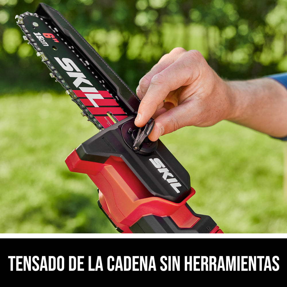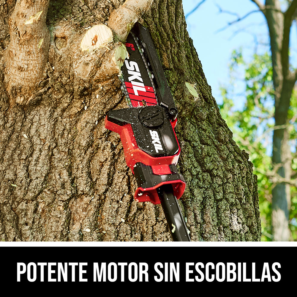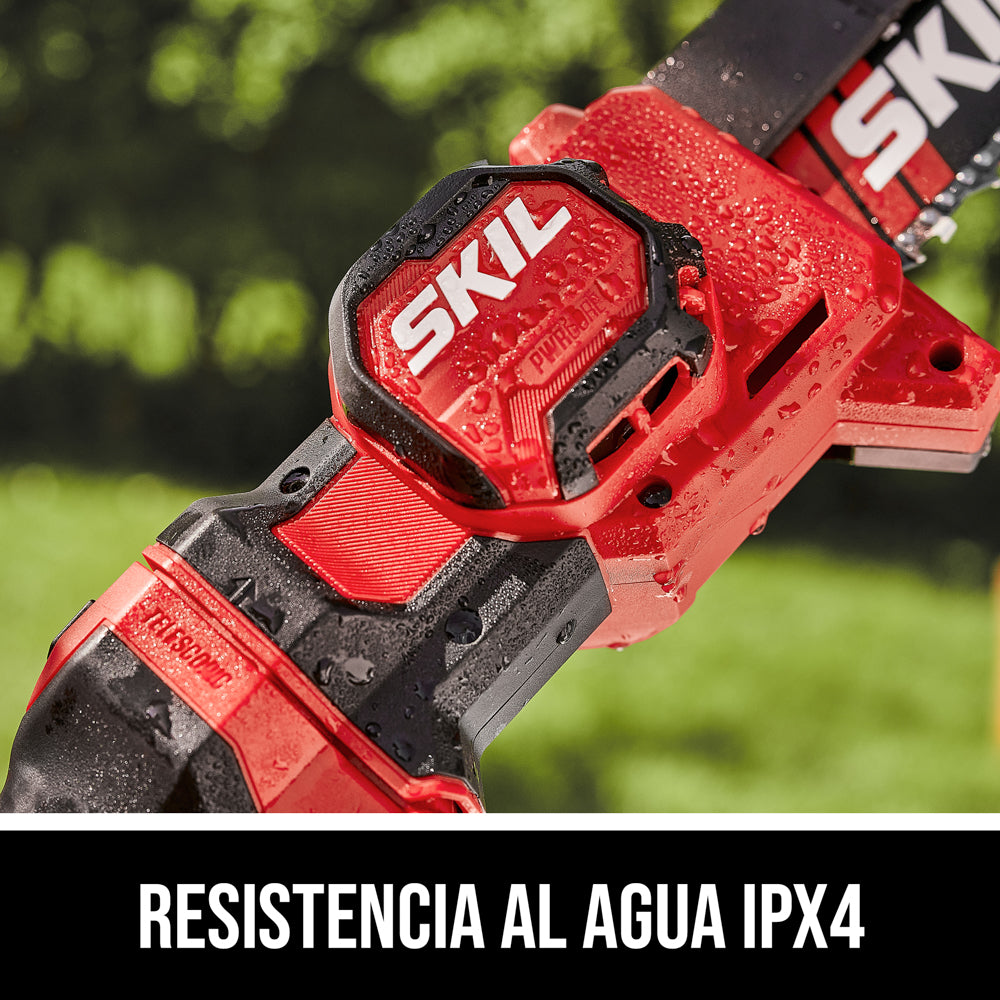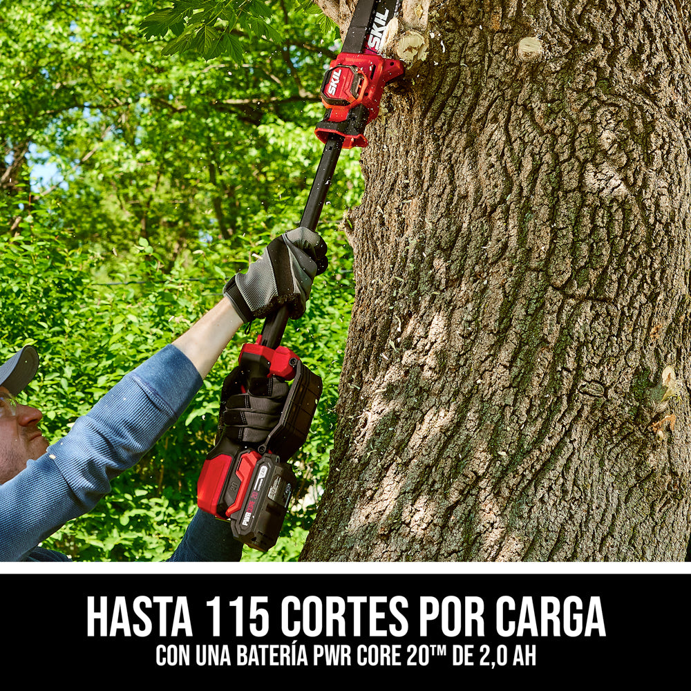 Eche mano de la sierra podadora telescópica de 6 pulgadas SKIL PWRCORE 20™ de 20 V sin escobillas para las necesidades de poda de servicio ligero. La sierra podadora inalámbrica está equipada con una espada y una cadena de 6 pulgadas y su pértiga se extiende hasta 2,8 pies de longitud total para ofrecer hasta 7 pies de alcance de corte. Su perfil compacto y ligero ofrece la máxima versatilidad de corte. Su potente motor sin escobillas produce hasta 115 cortes por carga con la batería PWRCORE 20™ de 2,0 Ah incluida. El tensado de la cadena sin herramientas permite realizar ajustes de la cadena con el simple giro de un dial. La resistencia al agua IPX4 añade durabilidad para uso en clima inclemente. Viene con un soporte EASYSTORAGE para almacenar y organizar contenientemente todo su equipo de energía para exteriores SKIL PWRCORE 20™. El kit incluye la sierra podadora telescópica inalámbrica de 6 pulgadas, una batería PWRCORE 20™ de 2,0 Ah y un cargador estándar PWRCORE 20™ de 20 V.
