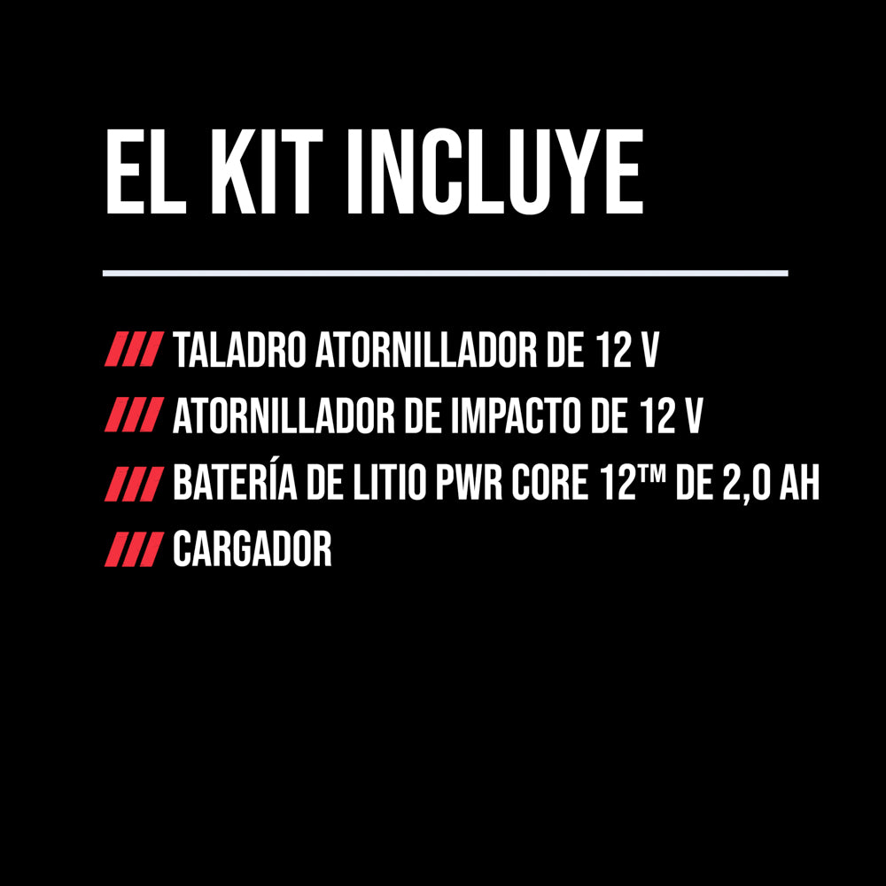 Qué está incluido: (1) atornillador de impacto SKIL PWRCORE 12™ de 12 V sin escobillas [ID6744A-00], (1) taladro atornillador SKIL PWRCore 12™ de 12 V sin escobillas [DL6290A-00], (1) batería USB-C de litio SKIL PWRCORE 12™ de 12 V y 2,0 Ah [BY5020A-00], (1) cargador SKIL USB-C PD de 20 W [PD0020B-00], (1) cable USB-C a USB-C de 3 A (PVC), (1) broca PH2 de dos puntas de 2 pulgadas, (1) broca PH2 de 2 pulgadas, (1) clip de cinturón