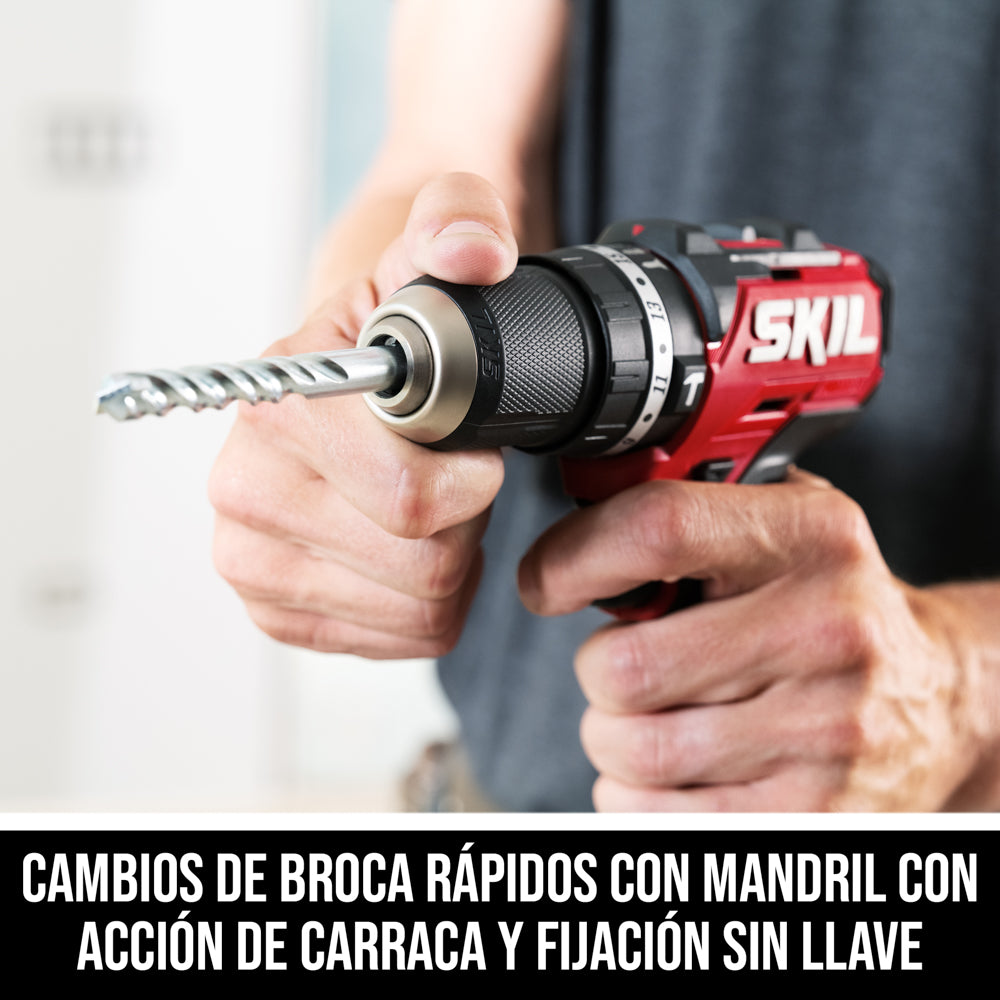 Realice trabajos difíciles en espacios reducidos con el kit de taladro de percusión de ½ pulgada SKIL PWRCORE 12™ de 12 V sin escobillas. Este taladro de percusión inalámbrico compacto de ½ pulgada es la herramienta eléctrica perfecta para taladrar y atornillar en superficies de ladrillo y mortero con su motor digital sin escobillas que produce hasta 350 pulgadas-libra de fuerza de torsión y 17 ajustes de fuerza de torsión para diversas aplicaciones de atornillado. Haga la transición fácilmente entre los modos de taladrado de percusión, taladrado y atornillado, y cambie las brocas rápida y fácilmente con su mandril de ½ con acción de carraca y fijación sin llave. Su gatillo de velocidad variable permite un control preciso de la velocidad y la luz LED con preiluminación e iluminación remanente proporciona la máxima visibilidad del espacio de trabajo.