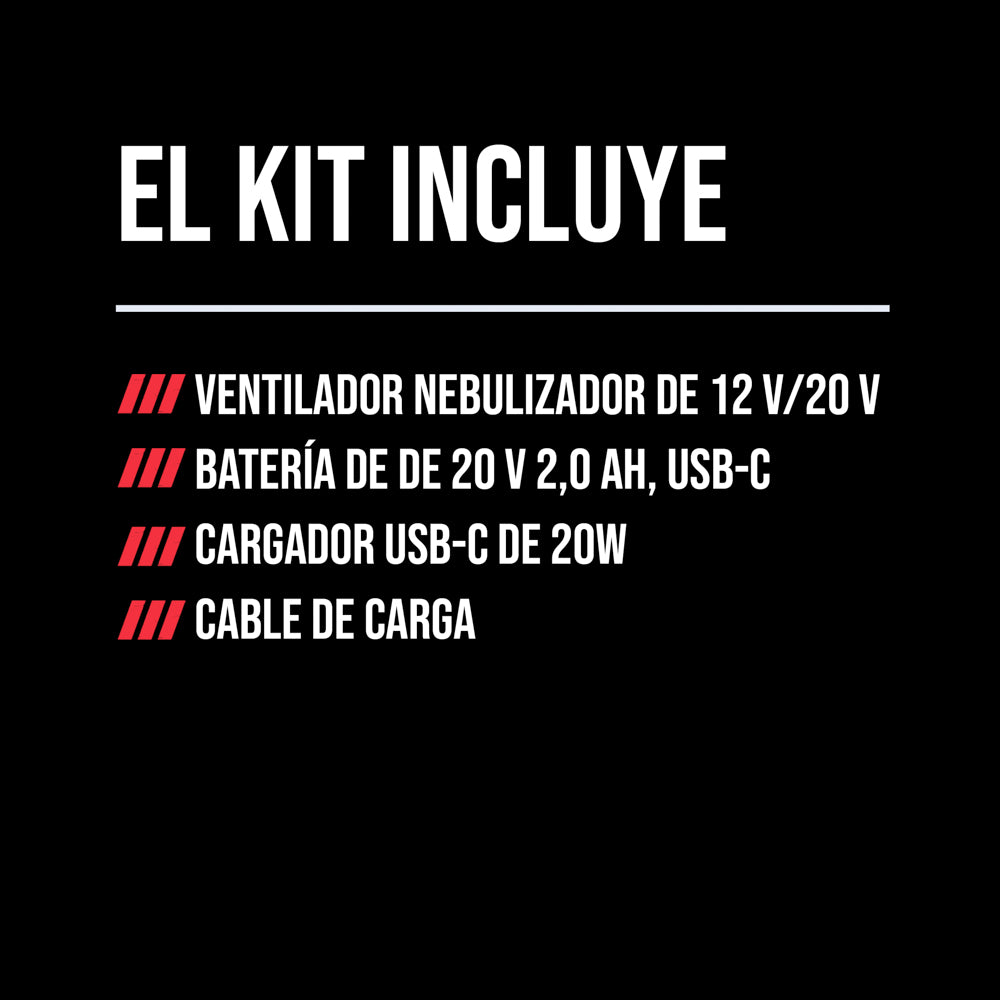 - KIT DE VENTILADOR NEBULIZADOR INALÁMBRICO: Incluye el ventilador nebulizador de 12/20 V, una batería USB-C de 20 V y 2,0 Ah, un cargador USB-C de 20 W y un cable de carga