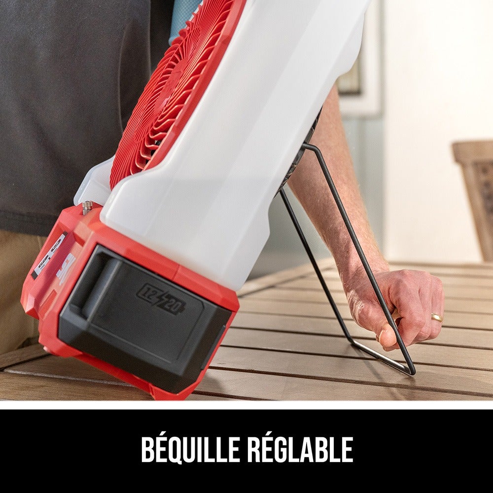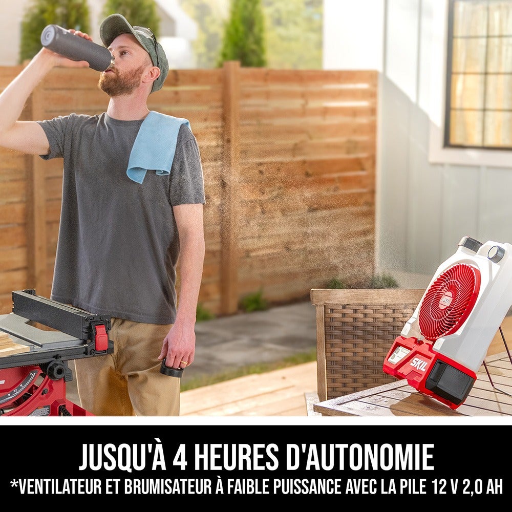 - JUSQU'À 4 HEURES D'AUTONOMIE - Fonctionne jusqu'à 4 heures (ventilateur et brumisateur à faible puissance) avec la pile 12 V 2,0 Ah incluse