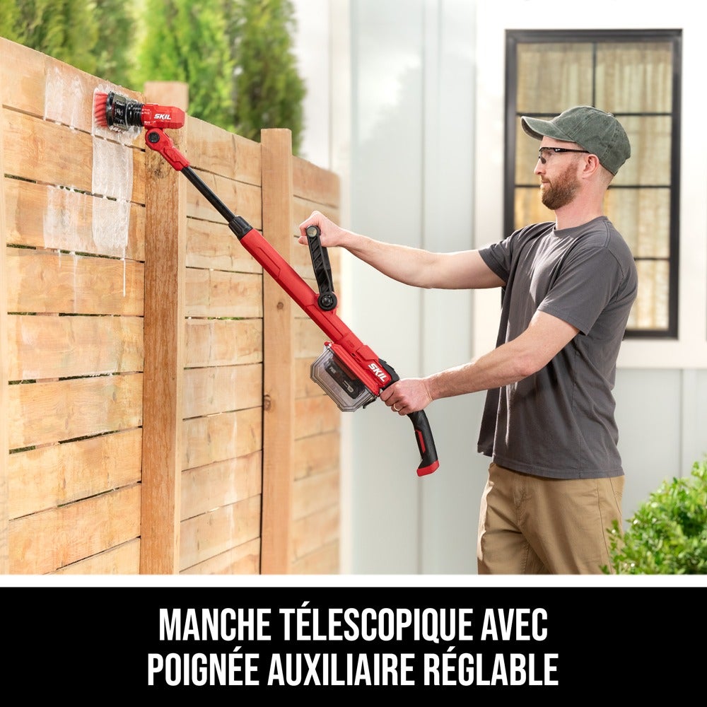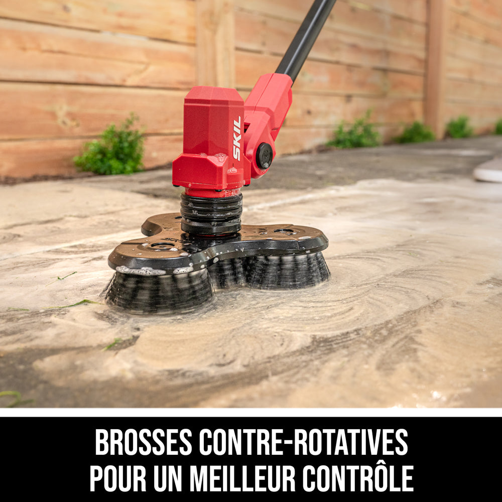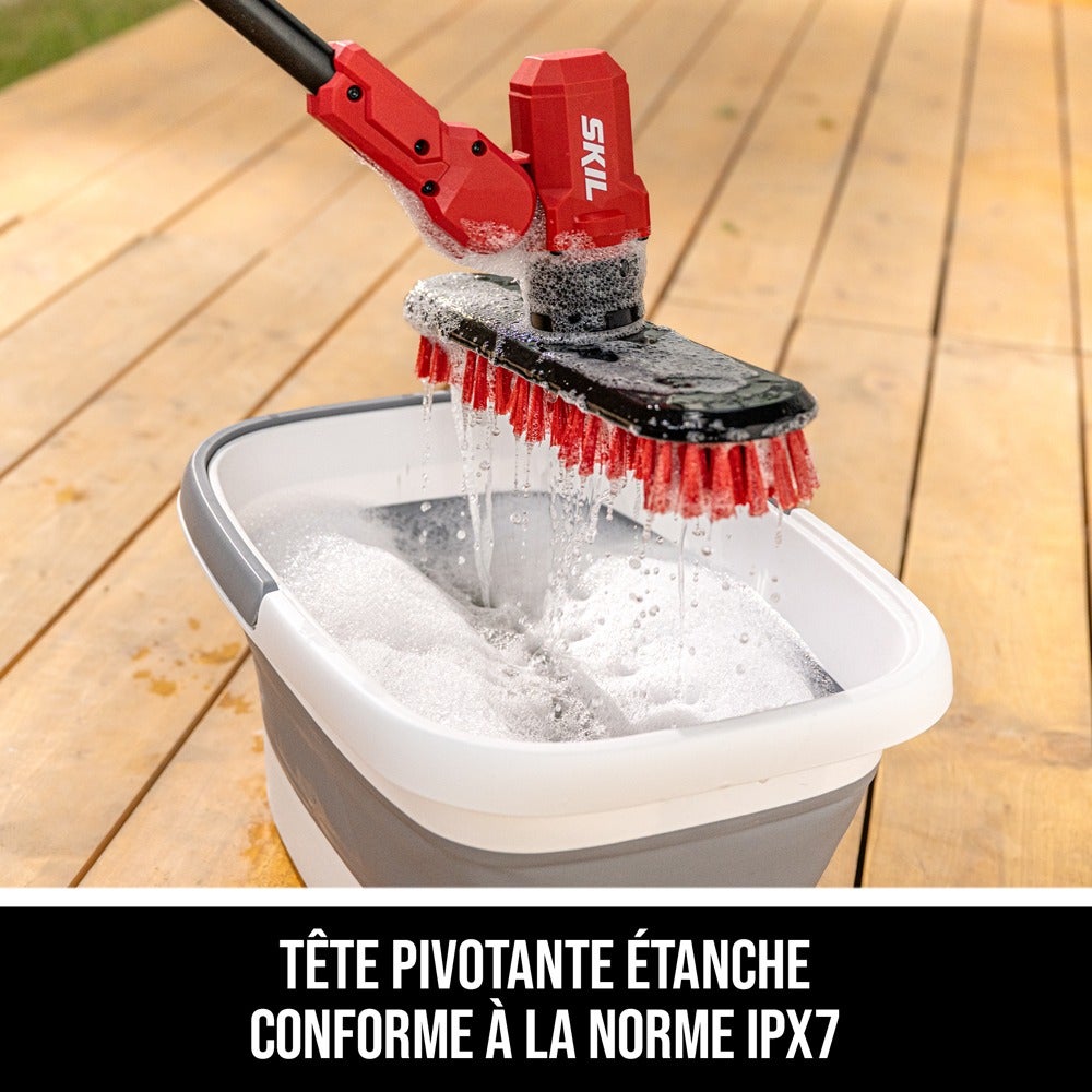 Nettoyez une grande variété de surfaces, des baignoires et carreaux de douche aux revêtements extérieurs, terrasses, patios, et bien plus encore, avec la brosseuse électrique SKIL de 12 V/20 V. Les brosses interchangeables à relâchement rapide permettent de changer facilement de tête de brosse pour passer rapidement d’une tâche à une autre. La tête étanche conforme à la norme IPX7 permet son immersion dans des seaux d’eau, et elle pivote pour être en contact total avec la surface sur laquelle vous travaillez. Le manche télescopique s’allonge pour vous permettre de nettoyer les endroits difficiles d’accès, et sa poignée auxiliaire ergonomique s’ajuste facilement pour offrir un meilleur contrôle et limiter la fatigue. Le commutateur à deux vitesses permet d’alterner entre 300 et 500 tours/minute pour diverses applications de nettoyage. Le kit de brosseuse électrique comprend deux brosses à poils moyens pour un nettoyage modéré des surfaces dures telles que les terrasses, les carreaux et les revêtements, ainsi qu’une brosse à poils durs pour un nettoyage intensif des surfaces rugueuses telles que la brique, le béton et d’autres éléments de maçonnerie. Chaque tête de brosse est équipée de plusieurs brosses contrarotatives qui assurent un meilleur contrôle et réduisent la fatigue en évitant l’emballement de l’outil. Un boîtier étanche protège la pile en cas d’exposition à l’eau. Le kit comprend une brosseuse électrique de 20 V, une pile de 20 V, 2,0 Ah, un chargeur de 20 V, 60 W, une brosse triangulaire à poils moyens, une brosse triangulaire à poils durs et une brosse longue à poils moyens.