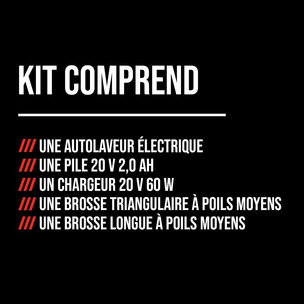 Ce qui est inclus: Autolaveuse électrique 12 V/20 V, brosse triangulaire à poils moyens, brosse triangulaire à poils durs, brosse longue à poils moyens, pile PWRCORE 20™ 20 V 2,0 Ah, chargeur PWRCORE 20™ 20 V 60 W