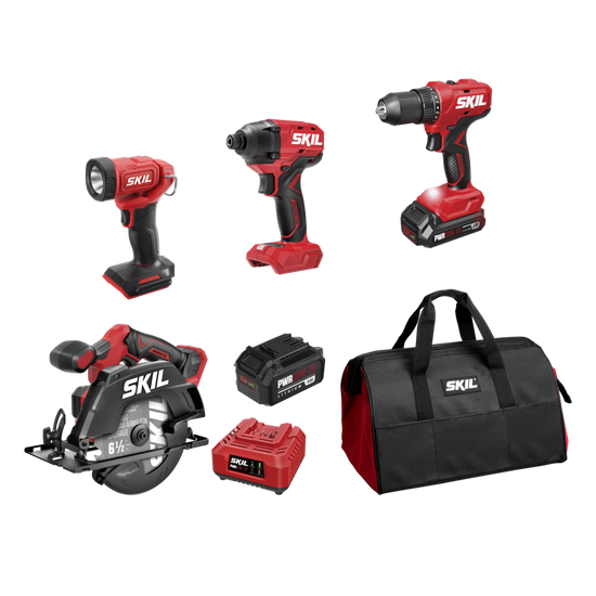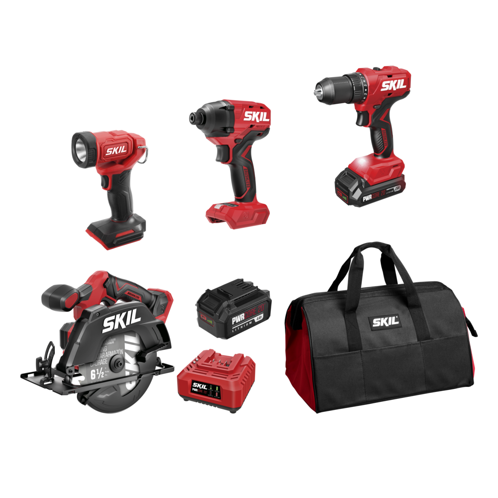 Ce qui est inclus: (1) Scie circulaire SKIL PWRCORE 20™ sans balais de 20 V, 6-1/2 po [CR6413B-00] ; (1) Projecteur SKIL de 20 V [LH552301] ; (1) perceuse-visseuse SKIL PWRCORE 20™ sans balais de 20 V, 1/2 po DL6280B-00] ; (1 ) Visseuse à percussion hex. SKIL PWRCORE 20™ sans balais de 20 V, 1/4 po [ID6720B-00] ; (1) Chargeur SKIL PWR CORE 20™ de 20 V [SC535801] ; (1) Pile SKIL de 20 V, 2,0 Ah PWRCORE 20™ au Lithium [BY519701] ; (1) Pile SKIL de 20 V, 4,0 Ah PWRCORE 20™ au Lithium [BY519601] ; (1) Lame de scie au carbure à trait de coupe fin à 18 dents ; (1) Clé Hex. (rangée sur l’outil) ; (1) Adaptateur pour aspirateur ; (1) Vis pour guide de refente ; (1) Embout PH2 à double extrémité de 2 po ; (1) Sac souple