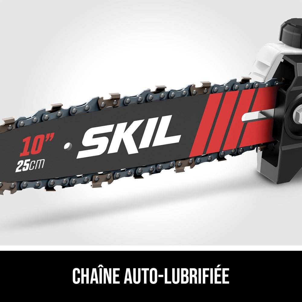 Élaguez et coupez des branches jusqu’à 10 pi de haut avec l’attachement de scie à élaguer à rallonge SKIL de 10 po. Cet attachement de scie à élaguer à rallonge sans fil pour le système SKIL à plusieurs têtes est équipé d’une barre de guidage de 10 po avec une capacité de coupe de 8 po qui est idéale pour l’élagage et la coupe de branches. Sa chaîne autolubrifiante permet de prolonger la durée de vie de la chaîne. Améliorez l’entretien de votre pelouse grâce au système SKIL à plusieurs têtes.