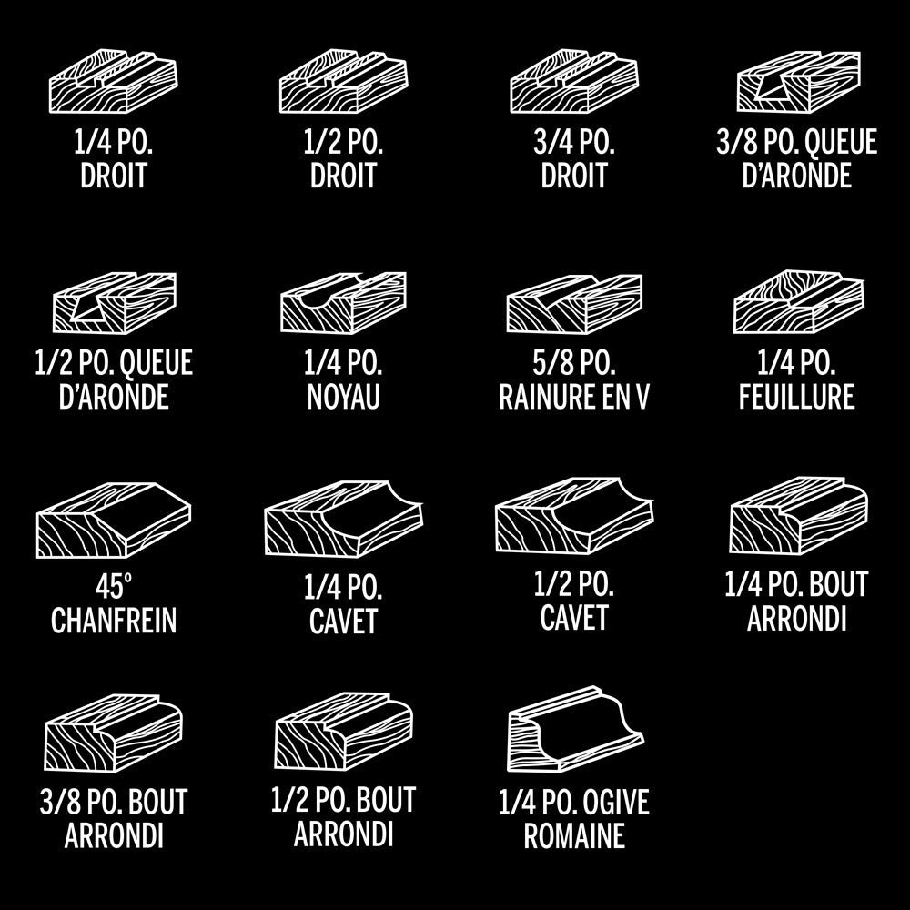 Ce qui est inclus: [3] droit : 1/4", 1/2", 3/4", [1] rainure en V : 5/8", [1] noyau : 1/4", [1] chanfrein : 45°, [2] anse : 1/4", 1/2", [2] queue d'aronde : 3/8", 1/2", [1] feuillure : 1/4", [3] arrondi : 1/4", 3/8", 1/2", [1] doucine romaine : 1/4", [1] Clé hexagonale, [2] Roulement de rechange : 3/8"