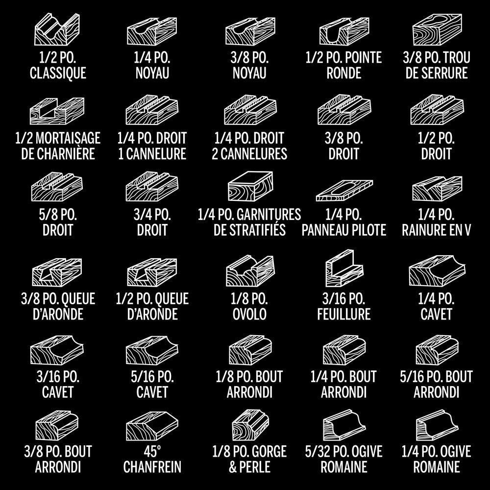 - COMPATIBLE AVEC - Les toupies montées sur une table à toupie ou les toupies portatives qui acceptent des fraises à tige de de ¼ po