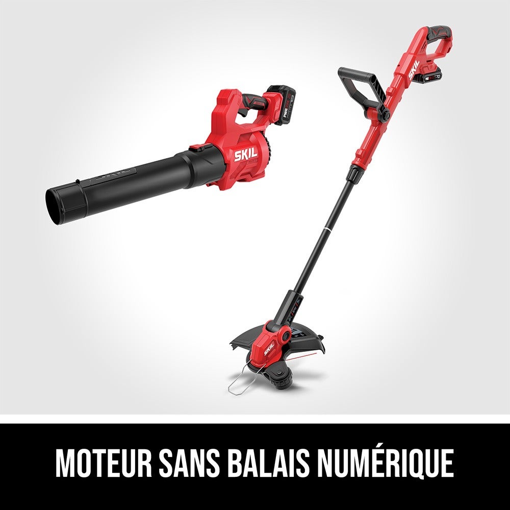Ce qui est inclus: (1) Taille-bordure SKIL 20 V 12 po [LT1200B-00], (1) Souffleuse à feuilles SKIL 20 V 420 CFM [BL0420B-00], (1) Pile au lithium SKIL 20 V 4,0 Ah [BY519601], (1) Chargeur SKIL 20 V 60 W [SC535801], (2) Support EASYSTORAGE