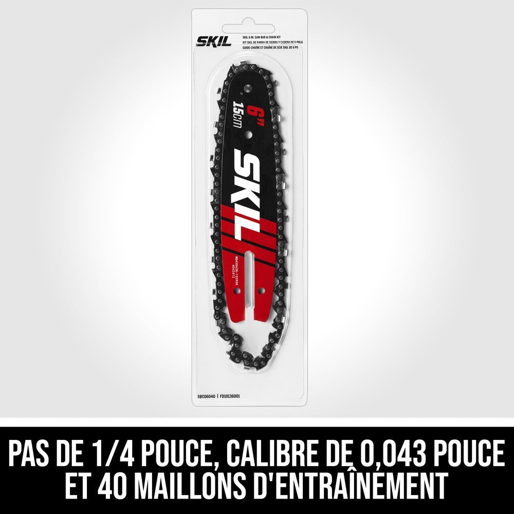 - Ce kit comprend une chaîne et une barre de scie de 6 po