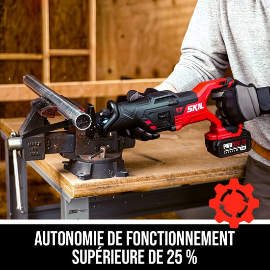 SKIL PWRCORE 20™ technology gives this battery powered electric saw power and performance. The PWRCORE 20™ Brushless 20V Reciprocating Saw efficiently and quickly cuts through wood and tough metal piping. Easily switch between linear and orbital mode, or adjust depth of cut with the pivoting shoe. Counterweights transfer less vibration, helping you work more comfortably. SKIL’s industry leading PWRCORE 20™ battery technology gives this cordless saw longer run time and battery life, so you can power through your task.