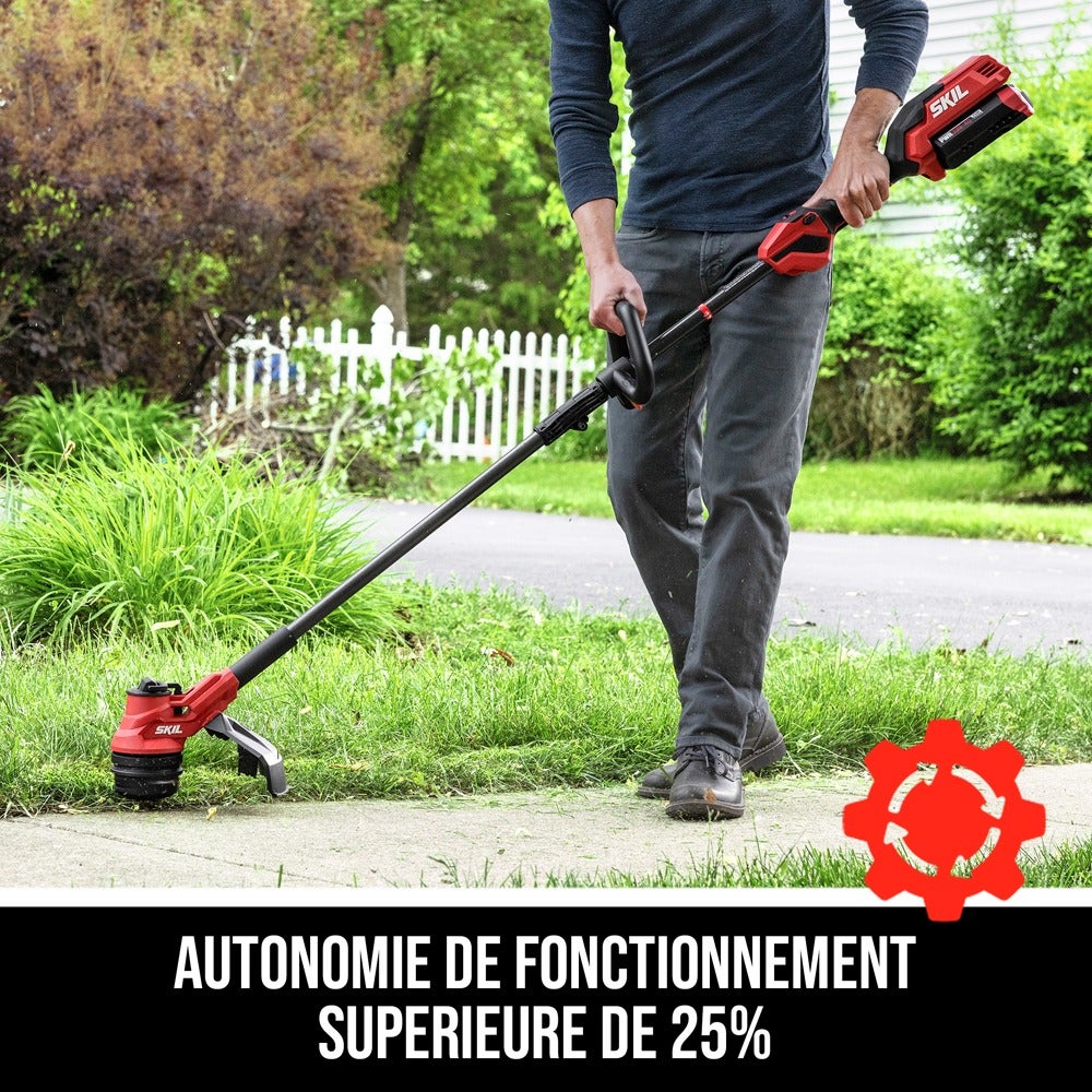 Le taille-bordure SKIL PWRCORE 40™ sans balais 40 V 38 cm (15 po) avec Smart Load™ est conçu pour la performance, l'efficacité et la simplicité d'utilisation, permettant de réaliser toutes sortes de travaux, de la taille légère à l'élimination des herbes et des mauvaises herbes les plus tenaces. Son moteur numérique sans balais et sa pile au lithium PWRCORE 40™ offrent la puissance nécessaire pour couper facilement les herbes et les mauvaises herbes les plus épaisses. La largeur de coupe de 38 cm (15 po) de ce taille-bordure électrique vous assure une coupe rapide et efficace, et son sélecteur à deux vitesses vous permet de choisir entre puissance et autonomie. Il suffit de tapoter la tête d'alimentation à double fil au sol pour libérer plus de fil et continuer à travailler. Lorsque le fil de 2 mm (0,080 po) doit être remplacé, ce taille-bordure sans fil est doté d'une tête Smart Load™ innovante qui permet un chargement rapide et facile du fil d'une simple manivelle. Améliorez l'entretien de votre pelouse, sans les tracas de l'essence, avec un taille-bordure sans fil conçu pour la performance, l'efficacité et la simplicité d'utilisation. Le kit de taille-bordure comprend une pile PWRCORE 40™ 2,5 Ah et un chargeur Auto PWRJUMP™.