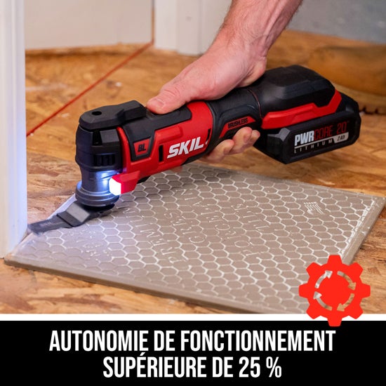 From cutting to sanding, scraping to chipping, this oscillating tool can do it all. The SKIL PWRCORE 20™ Multi Tool is built for power and performance, and runs on the innovation of SKIL PWRCORE 20™ lithium battery technology for longer battery life. This oscillating tool features the innovative Vibration Reduction System (VRS) which isolates the motor from the body of the tool to reduce vibration transfer and increase comfort, so you can power through hard cuts with ease. Plus—with variable speed control to finesse delicate or tough materials, constant speed technology to keep your grind consistent even through a harder material, and a soft start feature to get you started gently—you’ll have control all the way to the finish.