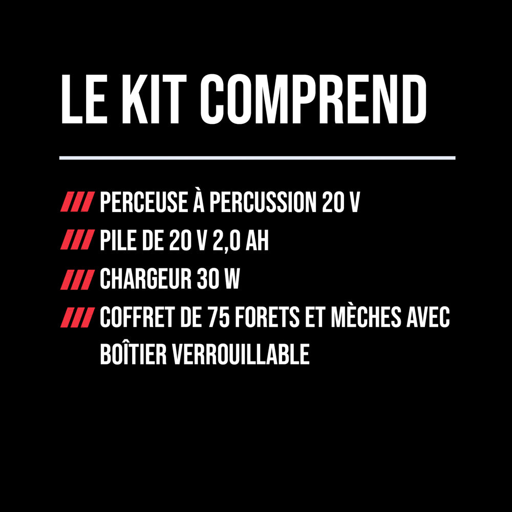 - LE JEU DE MARTEAU PERFORATEUR SANS FIL COMPREND - un marteau perforateur de 20 V, une pile de 2,0 Ah, un chargeur de 30 W, et 75 embouts/mèches avec une mallette à emboîtement