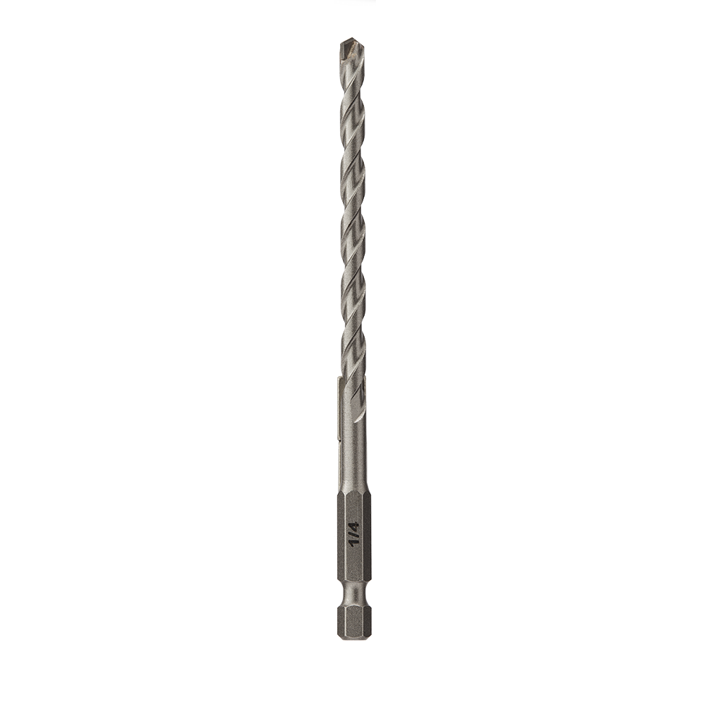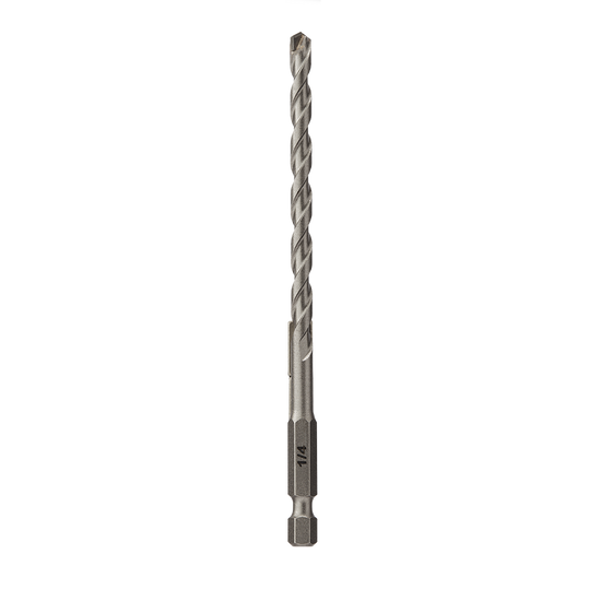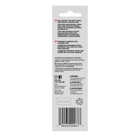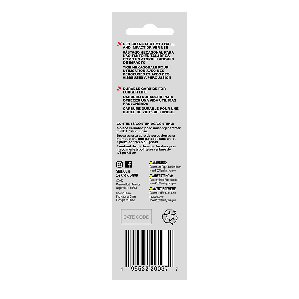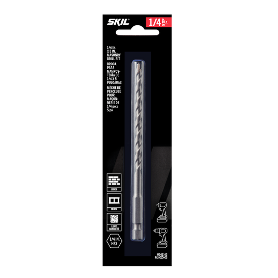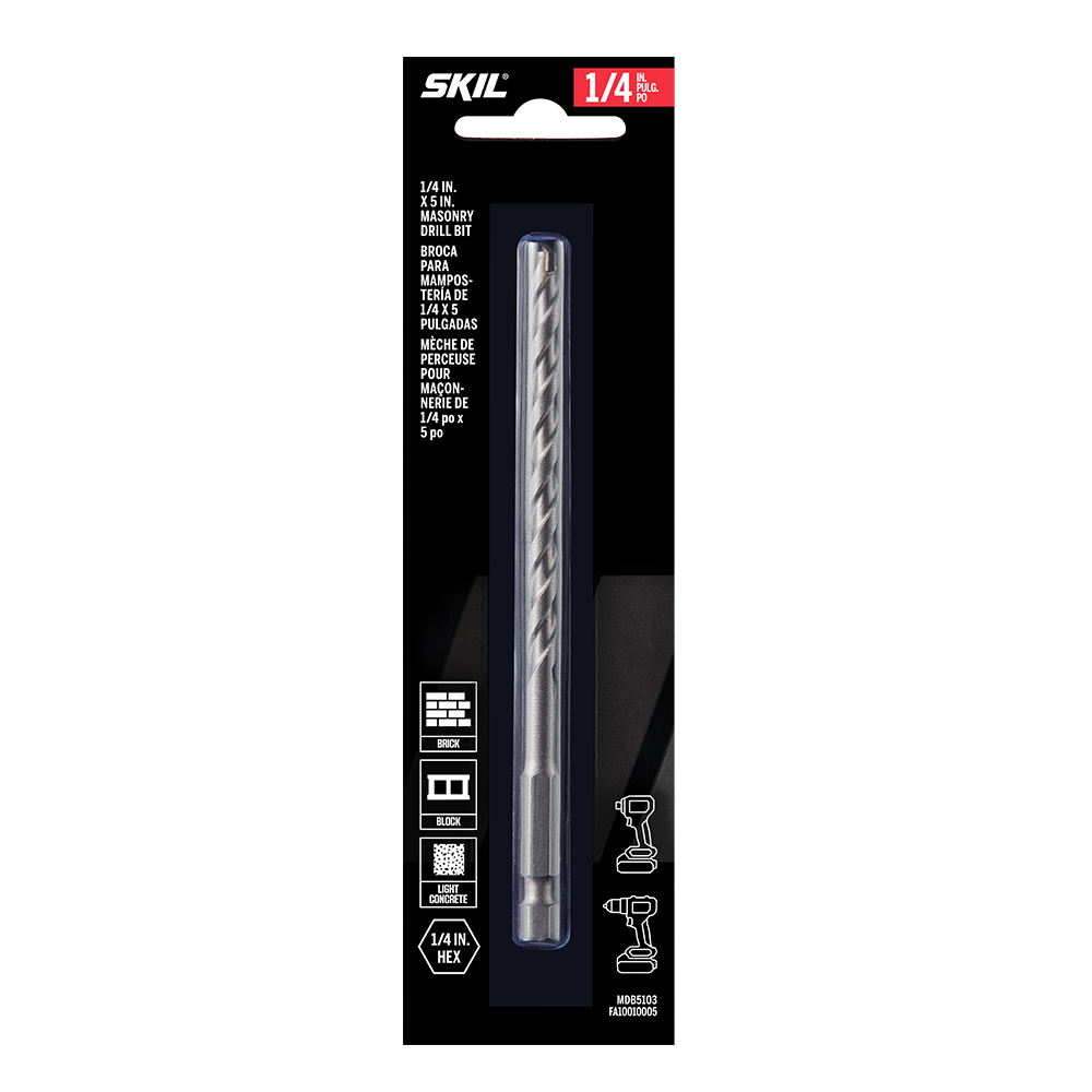 Posez des ancrages, percez des trous pilotes et traversez la brique, le parpaing, le béton ainsi que d’autres éléments de maçonnerie avec l’outil SKIL de 1/4 po. Mèche de perçage à pointe au carbure pour maçonnerie. Cette mèche pour maçonnerie de 1/4 po est dotée d’une pointe au carbure à double tranchant qui optimise la vitesse de perçage tout en conservant son tranchant. La mèche est dotée d’une pointe fendue optimisée pour la vitesse et la précision, tandis que les doubles cannelures permettent de retirer rapidement les débris sans ralentir la coupe de briques et de béton ou causer de coincement. La mèche pour maçonnerie peut être utilisée en mode de martelage et en mode rotatif. Sa tige hexagonale de ¼ po offre une excellente préhension avec un mandrin à trois mors ou un marteau perforateur ordinaire tout en étant compatible avec les visseuses à percussion. Traités thermiquement pour plus de solidité, la tige et le corps permettent à l’embout de résister aux abus du perçage de la maçonnerie comme les blocs, le béton et plus encore quand ils sont utilisés en mode de martelage. La mèche est clairement étiquetée en caractères gras afin de pouvoir l’identifier facilement – pas besoin de s’efforcer de lire un texte écrit en très petits caractères. Réalisez votre prochain projet de maçonnerie en toute confiance grâce à cet outil SKIL de 1/4 po. Mèche de perçage à pointe au carbure pour maçonnerie.