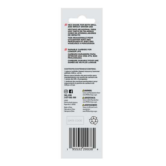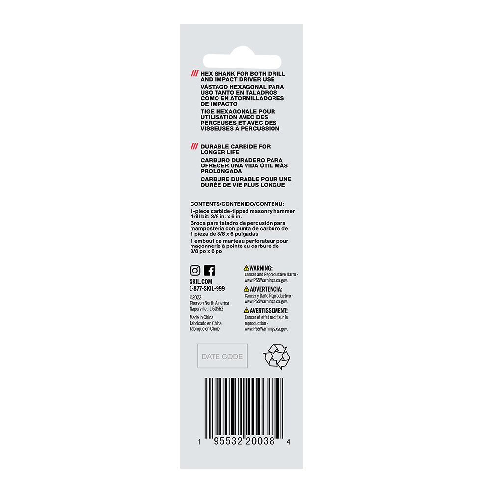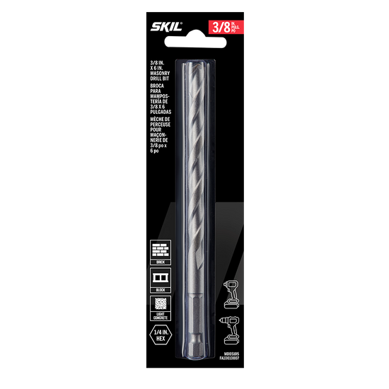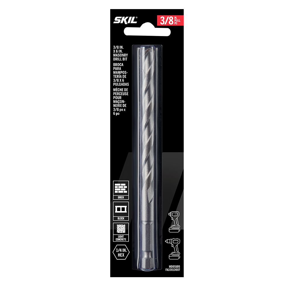Posez des ancrages, percez des trous pilotes et traversez la brique, le parpaing, le béton ainsi que d’autres éléments de maçonnerie avec l’outil SKIL de 3/8 po. Mèche de perçage à pointe au carbure pour maçonnerie. Cette mèche pour maçonnerie de 3/8 po est dotée d’une pointe au carbure à double tranchant qui optimise la vitesse de perçage tout en conservant son tranchant. La mèche est dotée d’une pointe fendue optimisée pour la vitesse et la précision, tandis que les doubles cannelures permettent de retirer rapidement les débris sans ralentir la coupe de briques et de béton ou causer de coincement. La mèche pour maçonnerie peut être utilisée en mode de martelage et en mode rotatif. Sa tige hexagonale de ¼ po offre une excellente préhension avec un mandrin à trois mors ou un marteau perforateur ordinaire tout en étant compatible avec les visseuses à percussion. Traités thermiquement pour plus de solidité, la tige et le corps permettent à l’embout de résister aux abus du perçage de la maçonnerie comme les blocs, le béton et plus encore quand ils sont utilisés en mode de martelage. La mèche est clairement étiquetée en caractères gras afin de pouvoir l’identifier facilement – pas besoin de s’efforcer de lire un texte écrit en très petits caractères. Réalisez votre prochain projet de maçonnerie en toute confiance grâce à cet outil SKIL de 3/8 po. Mèche de perçage à pointe au carbure pour maçonnerie.