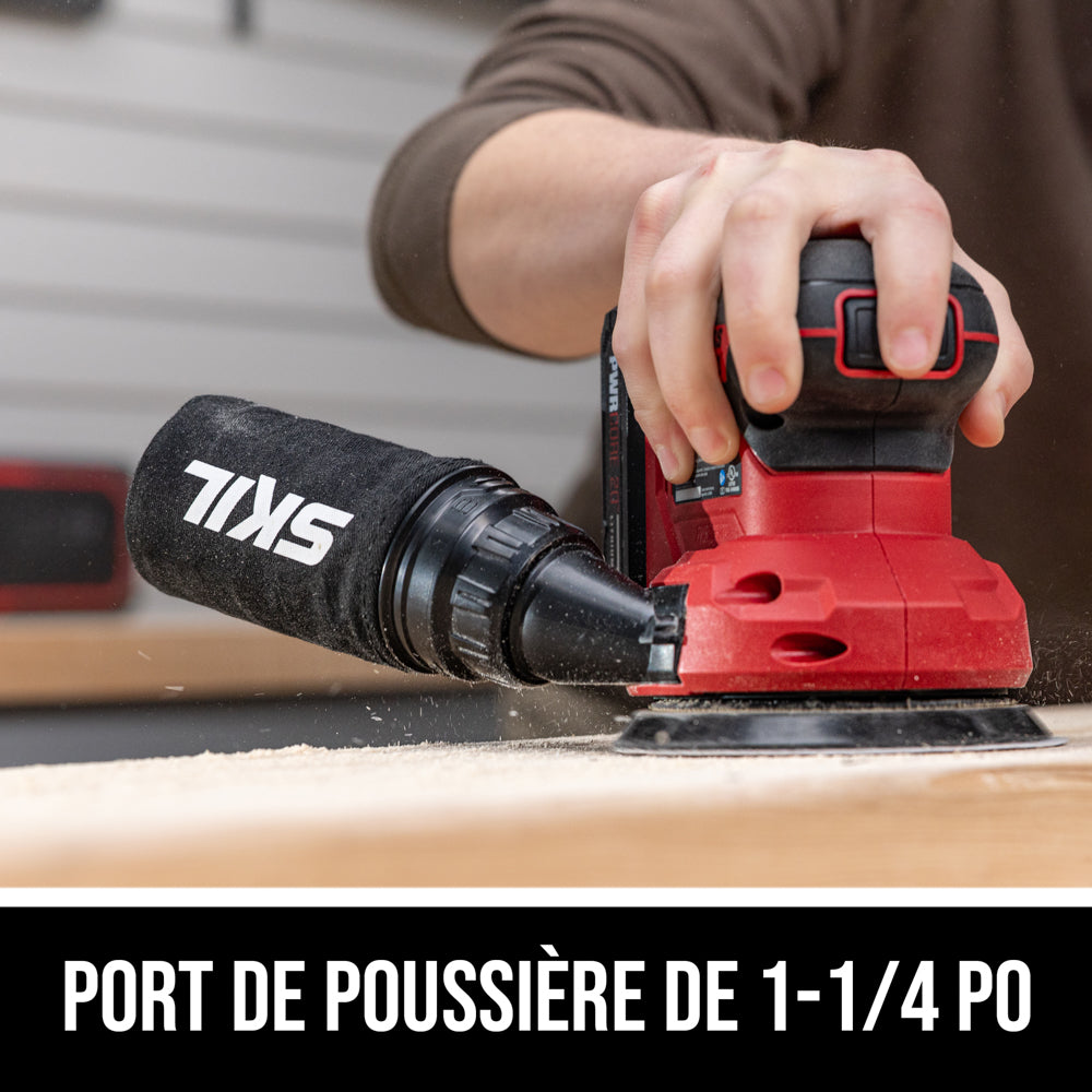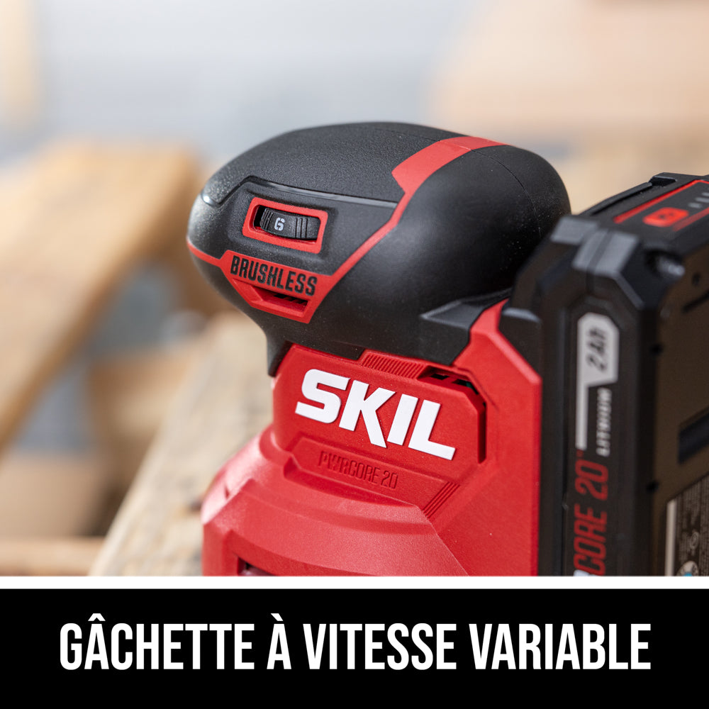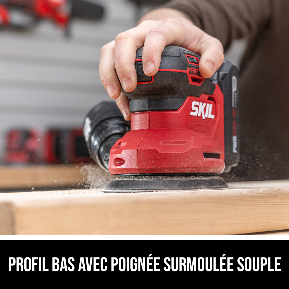 Apportez la touche finale à vos projets d’ébénisterie tels que la rénovation d’armoires et la remise à neuf de meubles avec la ponceuse orbitale aléatoire de 20 V de SKIL. Son moteur numérique sans balais offre des performances de ponçage élevées pouvant atteindre 11 000 OPM. La ponceuse électrique sans fil à profil bas est dotée d’une poignée souple surmoulée à ergonomie confortable pour assurer un meilleur contrôle. Elle est conçue pour réduire les vibrations, ce qui diminue la fatigue et prolonge le temps de travail. La molette de réglage de la vitesse permet de régler des vitesses précises avec un maximum de contrôle sur une grande variété de surfaces. Gardez votre zone de travail propre grâce à l’orifice de dépoussiérage de 1-1/4 po qui se connecte au sac à poussière ou à l’adaptateur d’aspirateur inclus. Le kit comprend la ponceuse sans fil, une pile de 20 V, 2,0 Ah, un chargeur de 20 V, un sac à poussière et (3) feuilles de papier de verre.