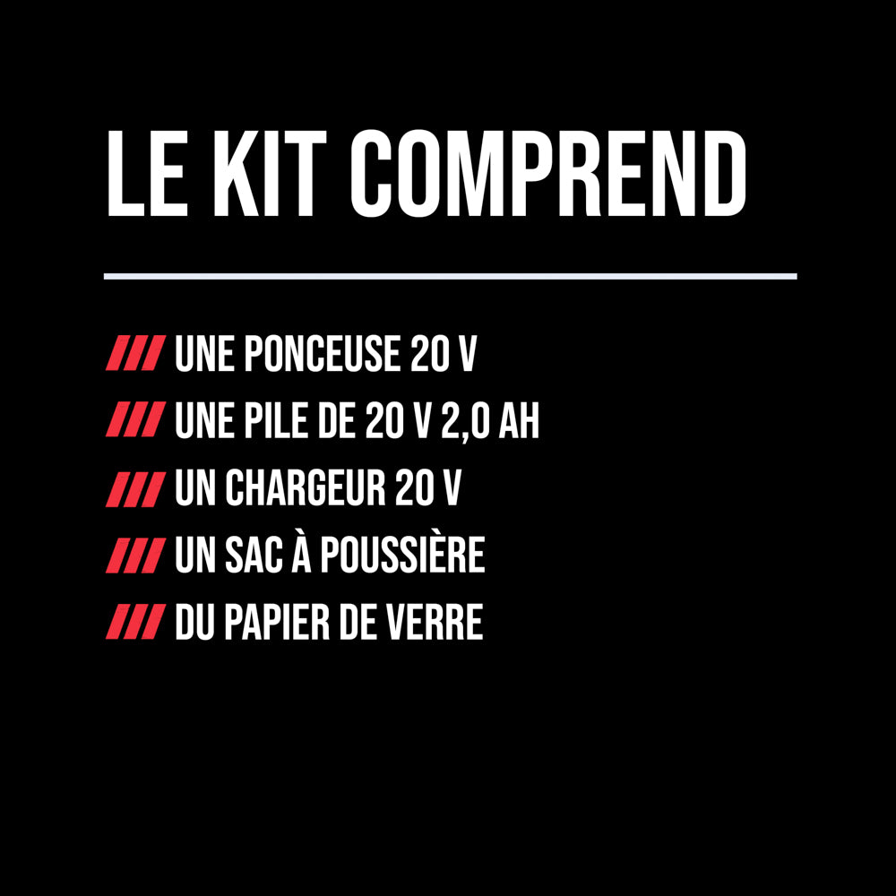 - - Le kit comprend la ponceuse de 20 V, une pile de 20 V, 2,0 Ah, un chargeur de 20 V, un sac à poussière et (3) feuilles de papier de verre