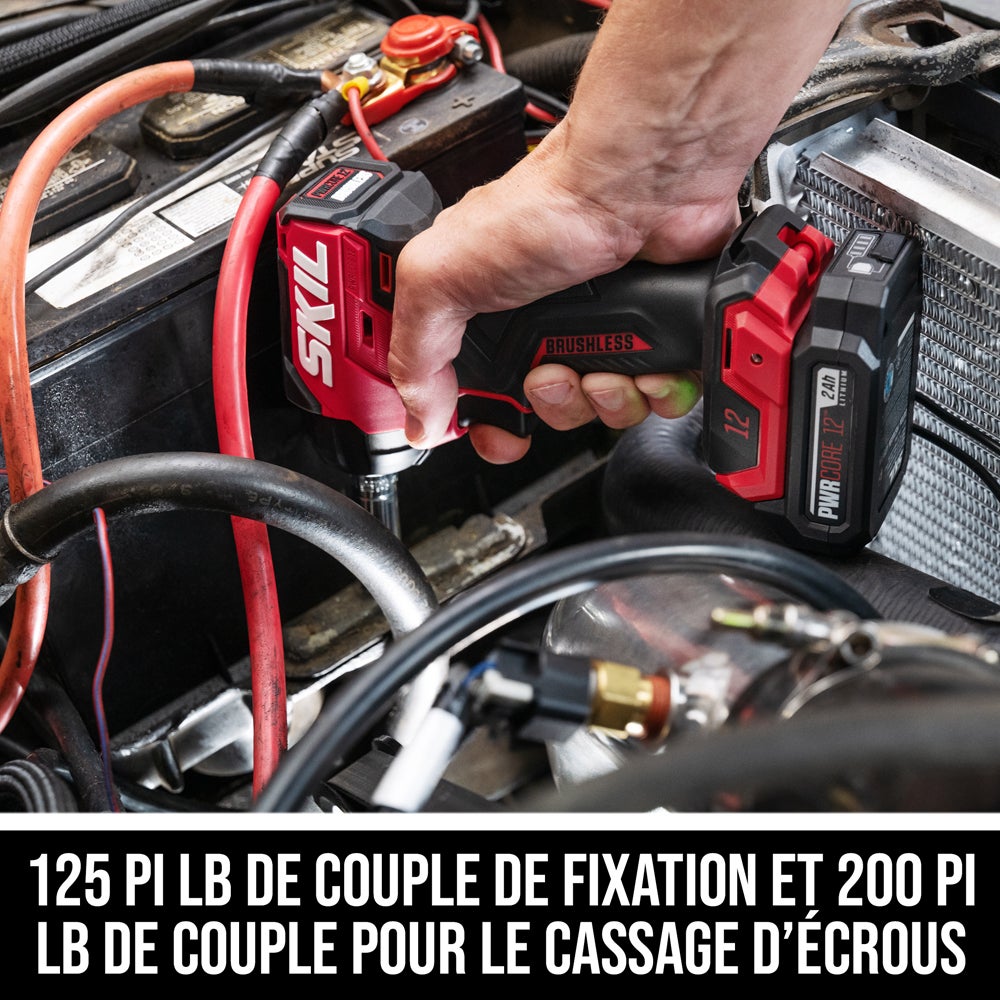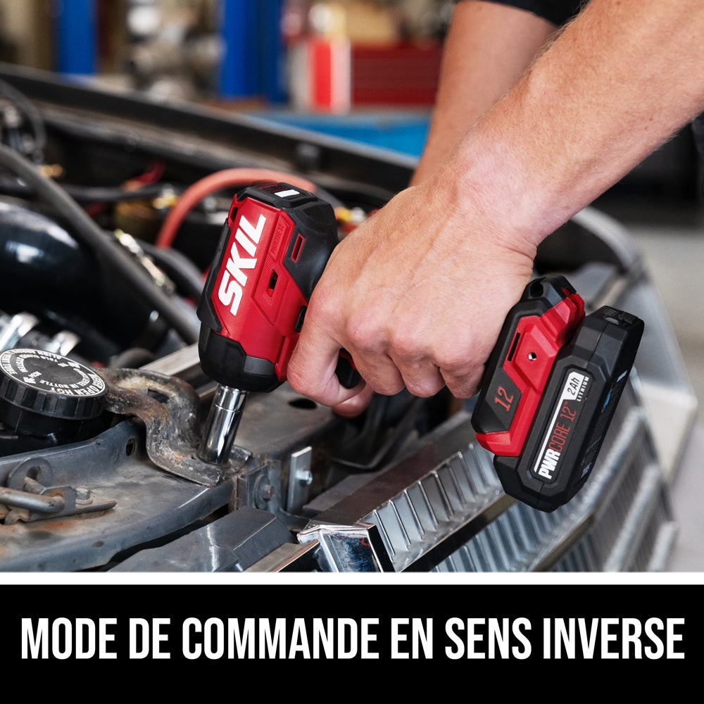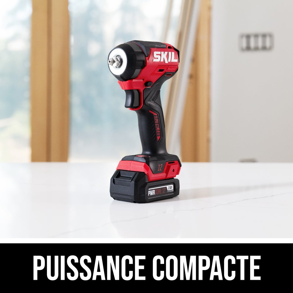 La clé à chocs SKIL PWRCORE 12™ sans balais de 12 V, 3/8 po vous offre une grande puissance dans un ensemble compact et léger avec jusqu’à 125 pi-lb de couple de fixation, 200 pi-lb de couple de casse-écrous et jusqu’à 3 400 IPM pour enfoncer les écrous et les boulons difficiles. Plus courte de 2,5 cm que les clés de la génération précédente, c’est la clé à chocs sans fil idéale pour travailler en hauteur dans les espaces difficiles d’accès. L’outil électrique est doté d’une enclume carrée de 3/8 po avec un anneau de friction pour faciliter le changement de douille, et son moteur numérique sans balais combiné à un choix entre trois vitesses possibles fournit une puissance de haute performance et un contrôle précis. Son système d’éclairage Halo Light™ fournit cinq fois plus de lumière que les lampes à DEL ordinaires tout en réduisant les ombres – et il éclaire votre espace de travail pendant jusqu’à 10 minutes.