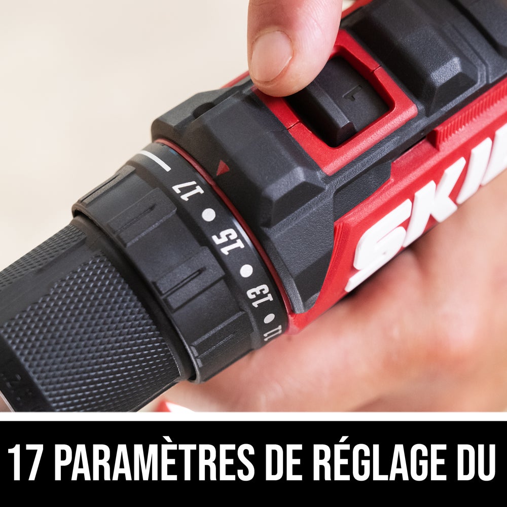 Percez avec puissance et précision une grande variété de surfaces grâce à la perceuse-visseuse sans fil SKIL PWR CORE 20™ 20 V sans balais de 13 mm (½ pouce). Son moteur numérique sans balais délivre jusqu'à 51 Nm (450 po-lb) de couple à chaque vissage. La gâchette à vitesse variable, les 17 réglages de couple et le mode perçage offrent un contrôle optimal pour tous vos projets. Changez d'embouts rapidement et facilement grâce au mandrin à cliquet sans clé de 13 mm (½ pouce) et éclairez votre espace de travail jusqu'à 10 minutes avec la bande LED dotée d'un pré-éclairage et d'un éclairage d'appoint. La perceuse-visseuse est fournie avec une pile PWR CORE™ 2,0 Ah 20 V USB-C à charge rapide bidirectionnelle, permettant de recharger la pile ou vos appareils via son port USB-C intégré. Ce kit de perceuse électrique sans fil comprend la perceuse-visseuse sans fil 20 V, une pile au lithium PWR CORE 20™ 2.0 Ah 20 V USB-C, un chargeur USB-C PD 45 W et un câble de chargement, un clip de ceinture et un embout de vissage.