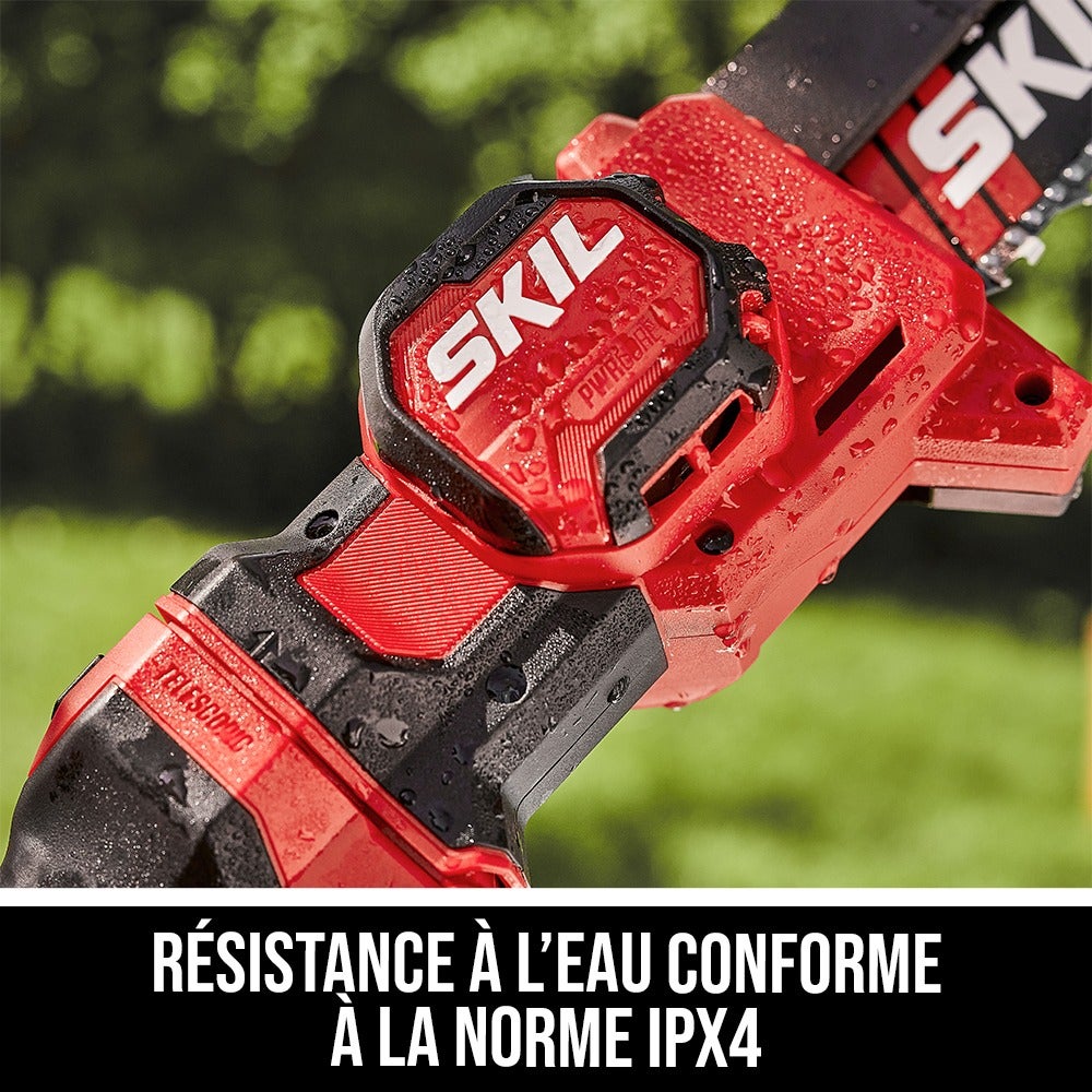 Utilisez la scie à élaguer télescopique SKIL PWRCORE 20™ sans balais de 20 V, 6 po pour les travaux d’élagage légers. La scie à élaguer sans fil est équipée d’une chaîne et d’une barre de 6 po, et son manche s’étend jusqu’à 2,8 pi de longueur totale, pour une portée de coupe allant jusqu’à 7 pi. Son profil compact et léger offre une polyvalence de coupe maximale. Son puissant moteur sans balai permet de réaliser jusqu’à 115 coupes par charge avec la pile PWRCORE 20™ de 2,0 Ah incluse. La tension de la chaîne peut être réglée sans outil -- la chaîne peut être ajustée par simple rotation d’une molette. La résistance à l’eau conforme à la norme IPX4 accroit la durabilité en permettant une utilisation même par mauvais temps. Elle est livrée avec un support EASYSTORAGE pour vous permettre de ranger et d’organiser de manière pratique tous vos équipements électriques d’extérieur SKIL PWRCORE 20™. Le kit comprend la scie à élaguer télescopique sans fil de 6 po, la pile PWRCORE 20™ de 2,0 Ah et le chargeur standard PWRCORE 20™ de 20 V.