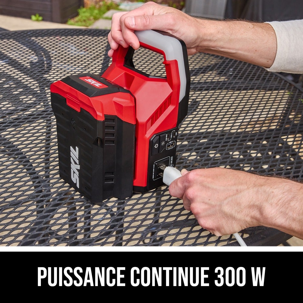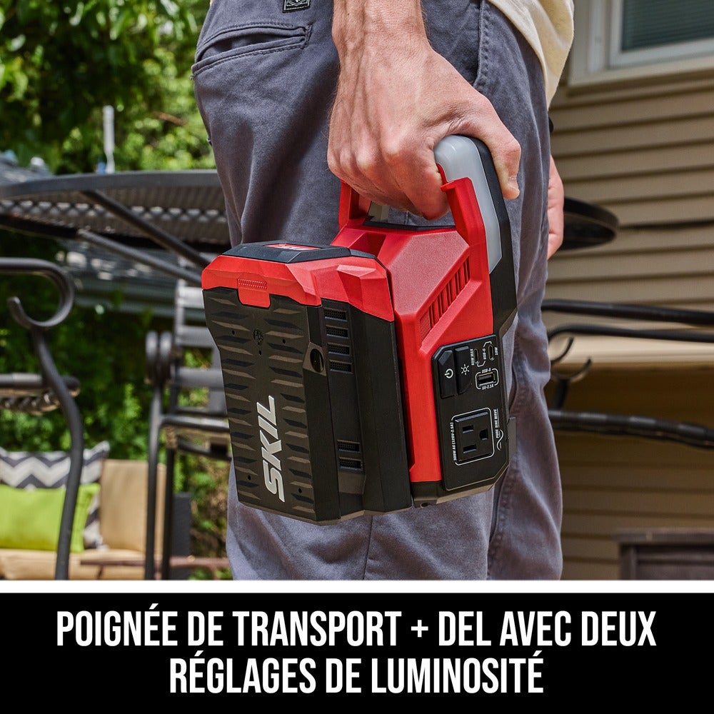 Apportez de l'énergie partout avec l'onduleur SKIL PWRCORE 40™ 40V 300W. L'onduleur sans fil fournit 300 watts de puissance continue avec jusqu'à 500 watts de puissance maximale. L'onduleur de 300 W alimente simultanément jusqu'à quatre appareils via sa prise standard de 120 V ou ses ports de sortie USB-A, USB-C et USB-C PD de 65 W. L'onde sinusoïdale pure fournit une énergie propre et de haute qualité aux composants électroniques sensibles. Une DEL avec deux réglages de luminosité est intégrée à la poignée de transport pratique pour apporter de l'énergie partout. Soutenez les petits appareils avec le support intégré de l'onduleur ou rangez un appareil mobile dans la poche du téléphone. L'onduleur est compatible avec toutes les piles SKIL PWRCORE 40™ (vendues séparément).