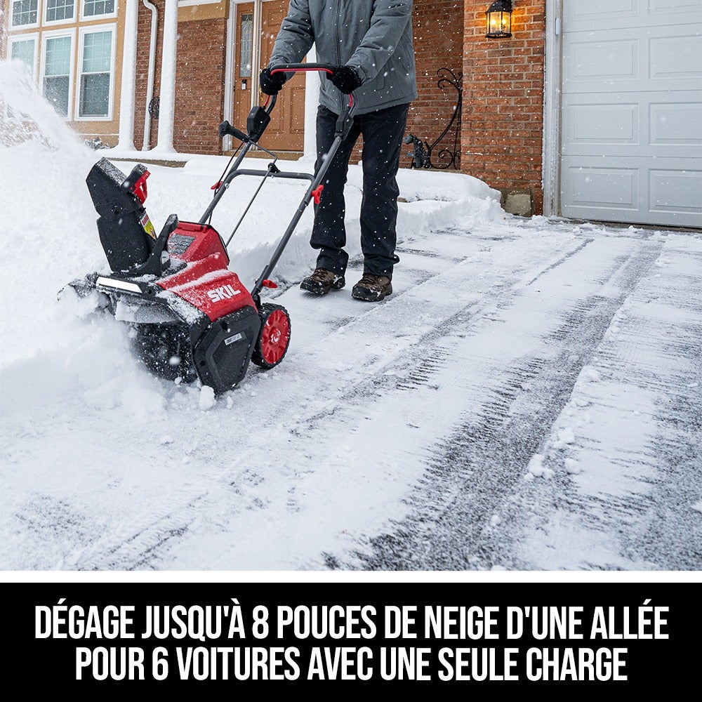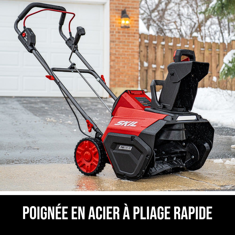 Projetez la neige jusqu’à 30 pi de distance de votre chemin avec la souffleuse à neige à un seul niveau SKIL PWRCORE 40™ de 20 po. Cette souffleuse à neige sans fil comporte un moteur numérique sans balais qui fournit une puissance efficace et performante pour assurer une durée de vie plus longue de l’outil sans les inconvénients de l’essence. La commande de la goulotte par manivelle arrière permet de changer rapidement et facilement la direction de la goulotte à 180 degrés. Cette souffleuse à neige alimentée par pile est dotée d’une vis sans fin en acier à pointe en caoutchouc pour permettre un meilleur nettoyage de la chaussée et comporte un phare à DEL qui améliore la visibilité dans des conditions de faible luminosité. Sa poignée en acier à pliage rapide permet un rangement facile et compact lorsqu’elle n’est pas utilisée et entre les saisons. Ce kit de souffleuse à neige sans fil comprend la souffleuse à neige de 40 V à un seul niveau, une pile PWRCORE 40™ de 6,0 Ah et un chargeur PWRCORE 40™ Auto PWRJUMP™.