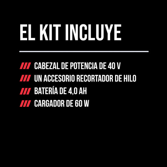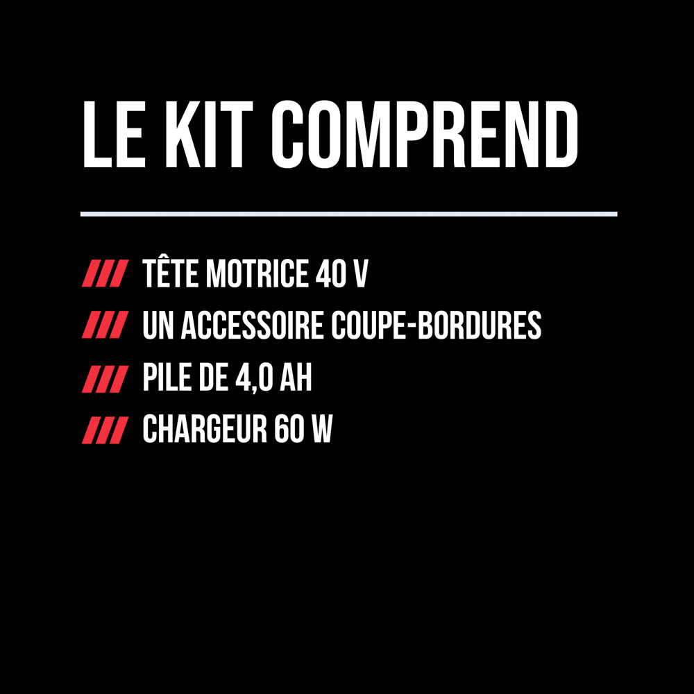 Ce qui est inclus: Bloc moteur de 40 V, attachement de taille-bordure-coupe-herbe de 16 po, pile de 4,0 Ah, chargeur