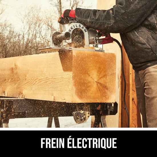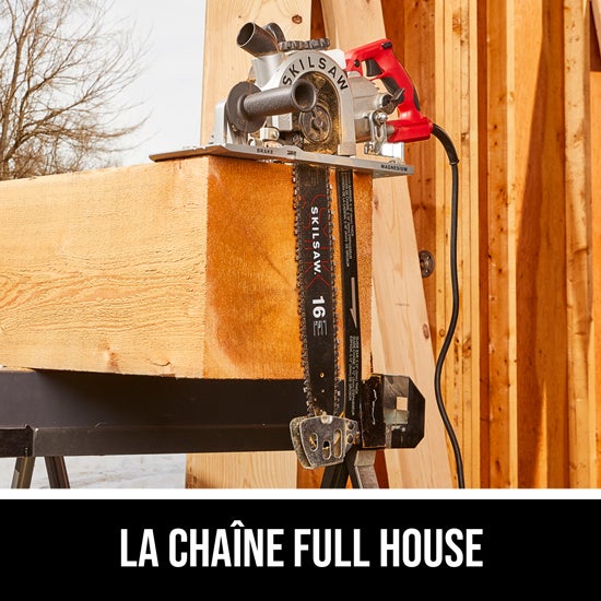 Ce qui est inclus: Tronçonneuse de menuiserie SPT55 16 po à entraînement par vis sans fin SAWSQUATCH™, chaîne SKILSAW 56 dents, guide-chaîne 16 po, poignée auxiliaire, support de scie, gaine de chaîne