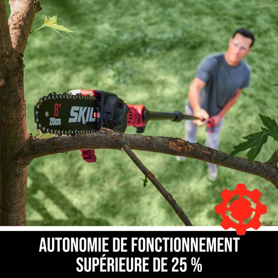 Obtenez des performances de pointe avec une scie à élaguer à long manche sans fil alimentée par la technologie des piles au lithium SKIL PWRCORE 20™. La scie est équipée d’une tête pivotante à barre et à chaîne de 8 po, ainsi que d’un arbre en aluminium extensible de 3,5 pi, ce qui permet de transformer facilement la scie à élaguer de 6,5 pi à 10 pi. De plus, cette scie est équipée d’une tête pivotante à 135° et de 8 préréglages, ce qui permet un meilleur contrôle et une plus grande commodité pour les branches difficiles à atteindre. La scie à élaguer est équipée d’une chaîne autolubrifiante pour réduire les frottements et améliorer la durabilité, tandis que la tension de la chaîne réglable sans outil permet des réglages sans problème pendant le travail. Ce kit de scie à élaguer comprend une pile PWRCORE 20™ de 2,0 Ah, 20 V et un chargeur, ainsi qu’un support de rangement facile pour ranger aisément tous vos équipements d’extérieur SKIL