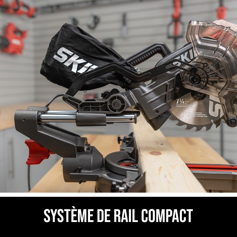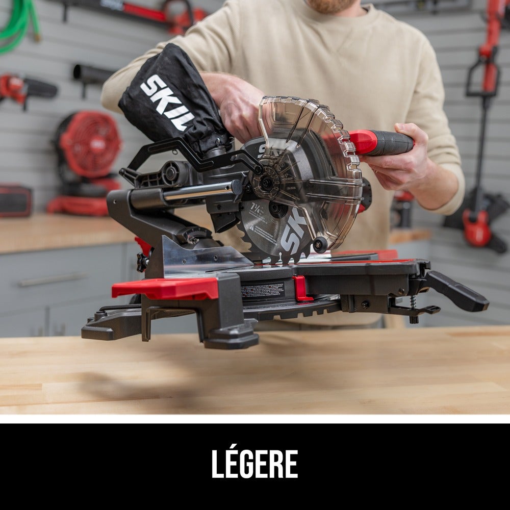Faites des coupes précises pour les plinthes, les moulures et les couronnes, ou coupez des planches pour les étagères et les bibliothèques en utilisant la scie à onglets coulissante à un seul biseau SKIL de 10 ampères, 7-1/4 po. La scie à onglets est équipée d’une ligne d’ombre à DEL qui permet de réaliser des coupes avec une plus grande précision que les lasers. Son verrouillage rapide de l’onglet permet des réglages rapides et précis de l’angle d’onglet, tandis que son moteur de 10 ampères atteint 4 800 tr/min pour effectuer des coupes rapides et précises. Cette scie à onglets à un seul biseau est légère et facile à transporter et à ranger. Son système de rail compact réduit l’encombrement de la scie et permet de réaliser des coupes au ras des murs. Son biseau unique permet des coupes de 0 à 45 degrés à gauche, tandis qu’une bride de fixation rapide de l’ouvrage sécurise rapidement les matériaux pour produire une coupe plus sûre. La scie à onglets est livrée avec un sac à poussière, une clé Allen à double extrémité, une bride de fixation rapide et une lame au carbure à 24 dents de 7-1/4 po.